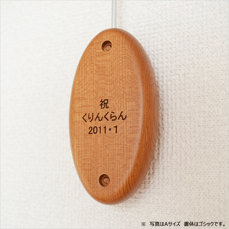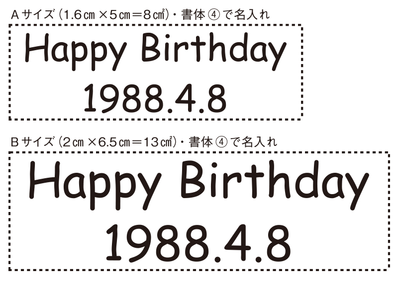 Aサイズは8平方センチメートルの範囲内、Bサイズは13平方センチメートルの範囲内に名入れ加工をいたします。面積での指定になりますので、文字数の制限はありません。