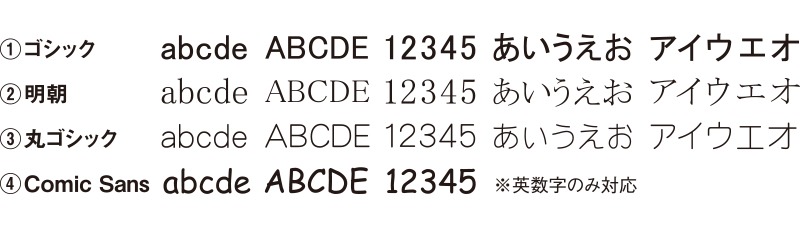 書体は、ゴシック、明朝、丸ゴシックは[日本語・英数字]で名入れが可能です。Comic Sansは[英数字]のみとなりますので、日本語はお入れできません。