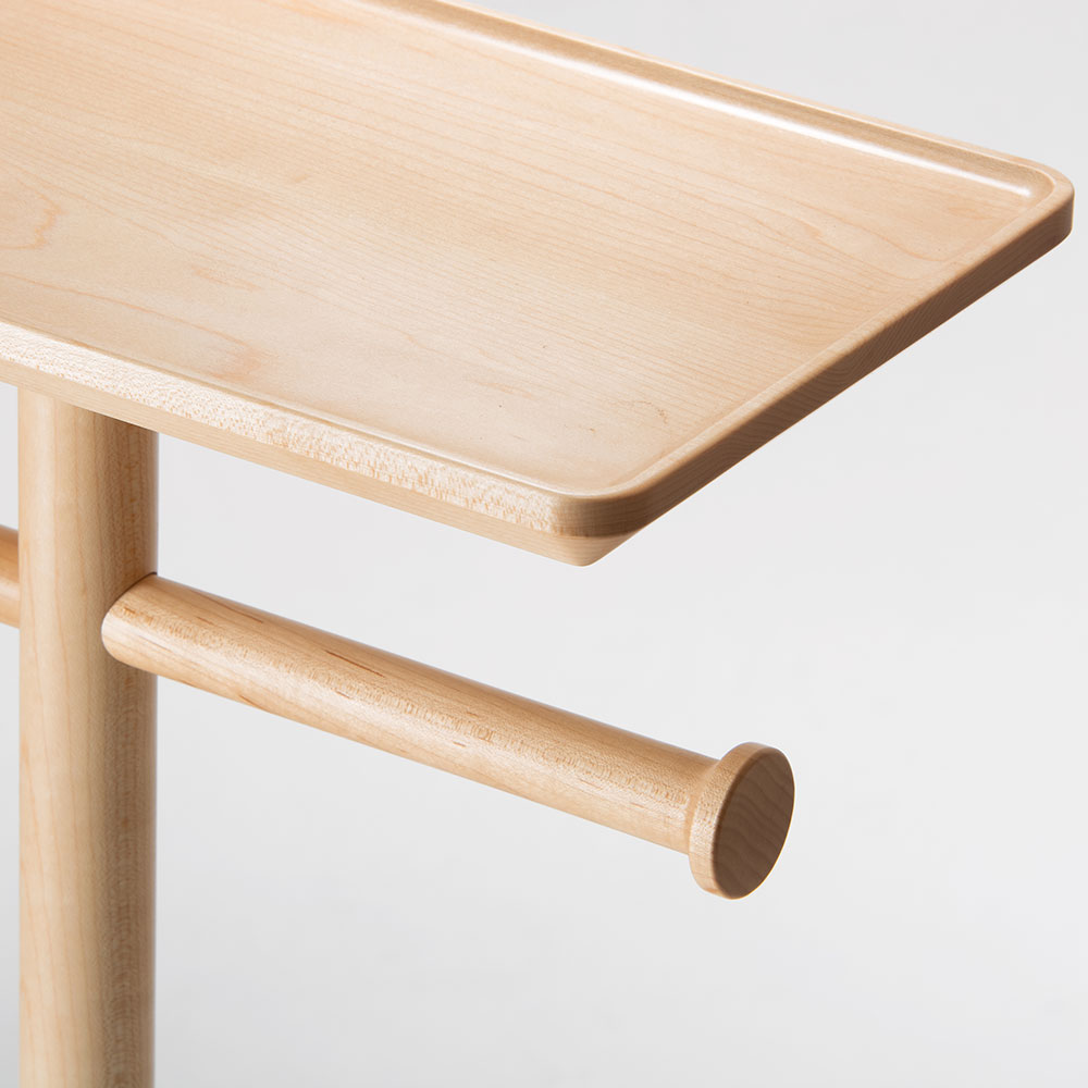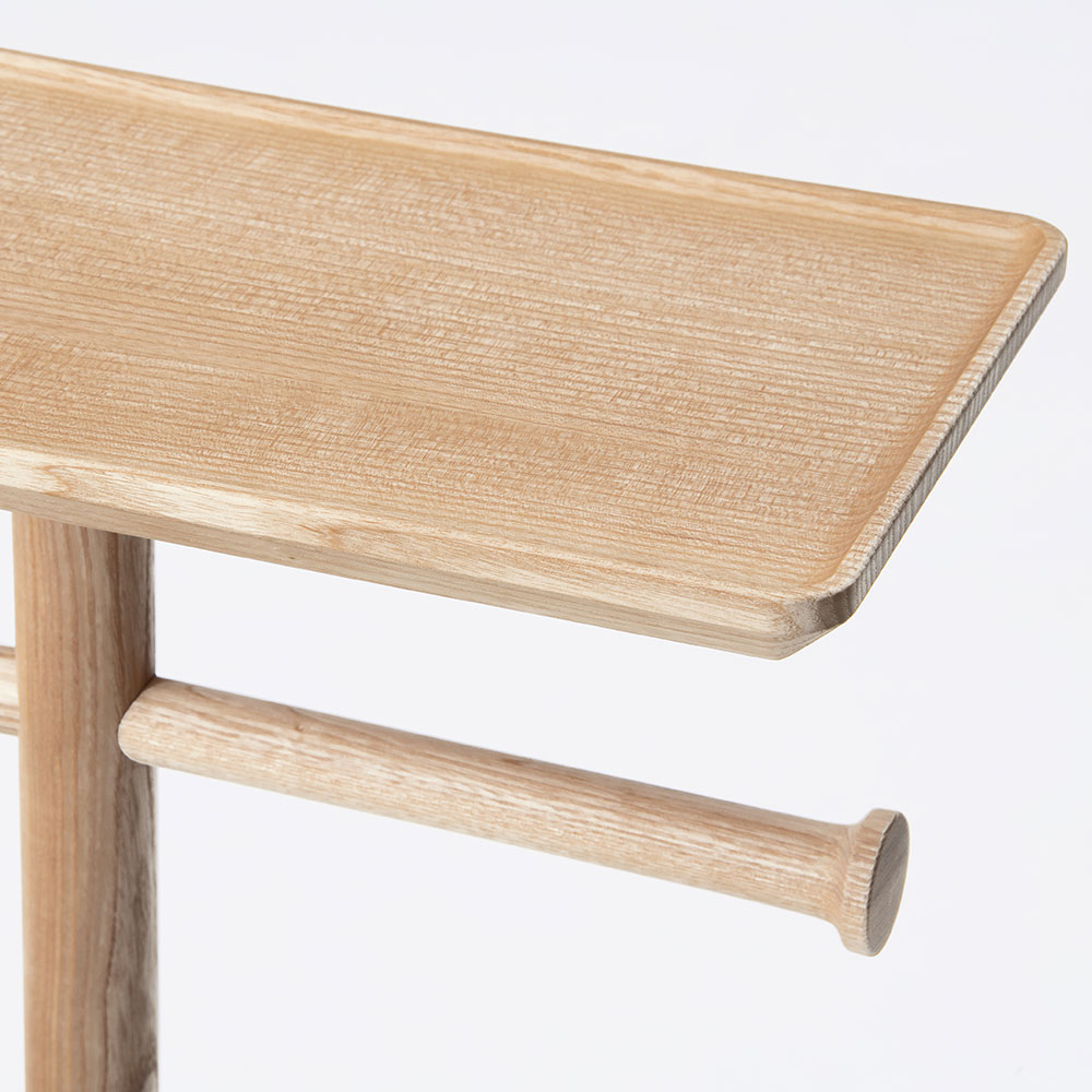 お風呂に入る際に使用するコンパクトなテーブル。入浴時にメガネやスマートフォン、アクセサリーなどを一時的に置くことができ、天板下にバスタオルを掛けておくことができます。ベースに約2kgの錘を内蔵し安定感をもたせており、天板には立ち上がりがあるので、物が落ちるのを防いでくれます。木目が際立つすっきりとした佇まいですが、天板の掘り込みやタオル掛けの両端の削り出しなど、無垢材の魅力を引き出すディティールが特徴的なテーブルです。