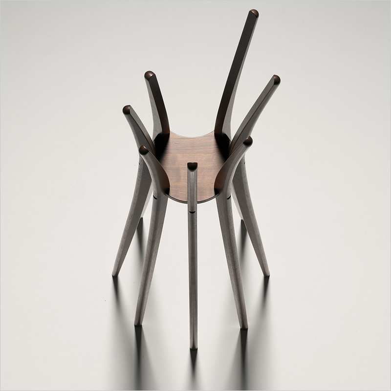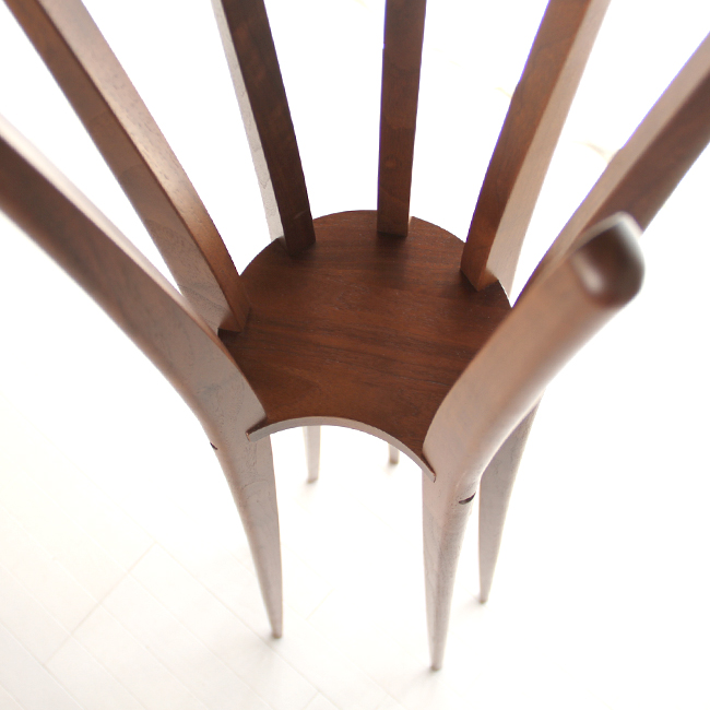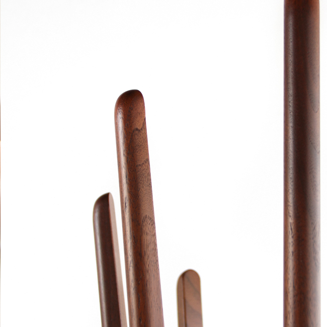 放射状に伸びた7本の棒材は加工精度と接着技術が求められるフィンガージョイント加工でつなぎ、なめらかな曲線に削り出しました。