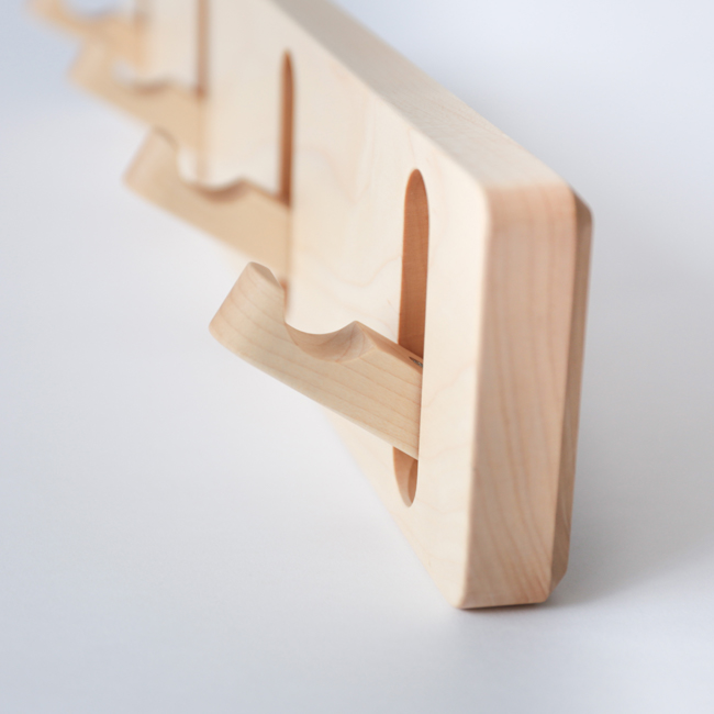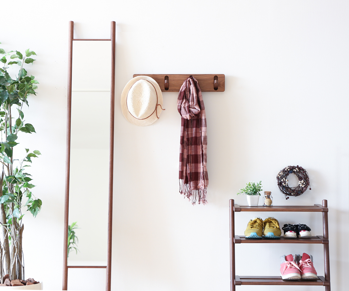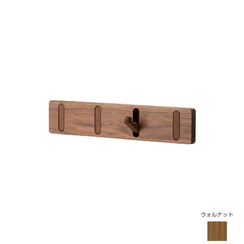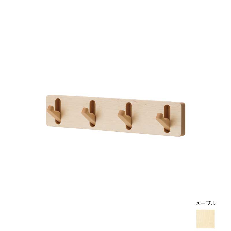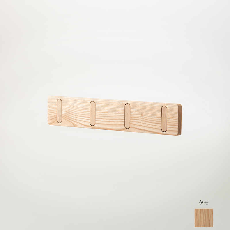 木のやさしい素材感が感じられる、まるで壁に板を張り付けたようなウォールフック。細部まで丁寧に仕上げ、使い勝手に拘った掛部が特徴です。4つの掛部から使いたいところだけを引き出してお気に入りのアウターや帽子がかけられます。