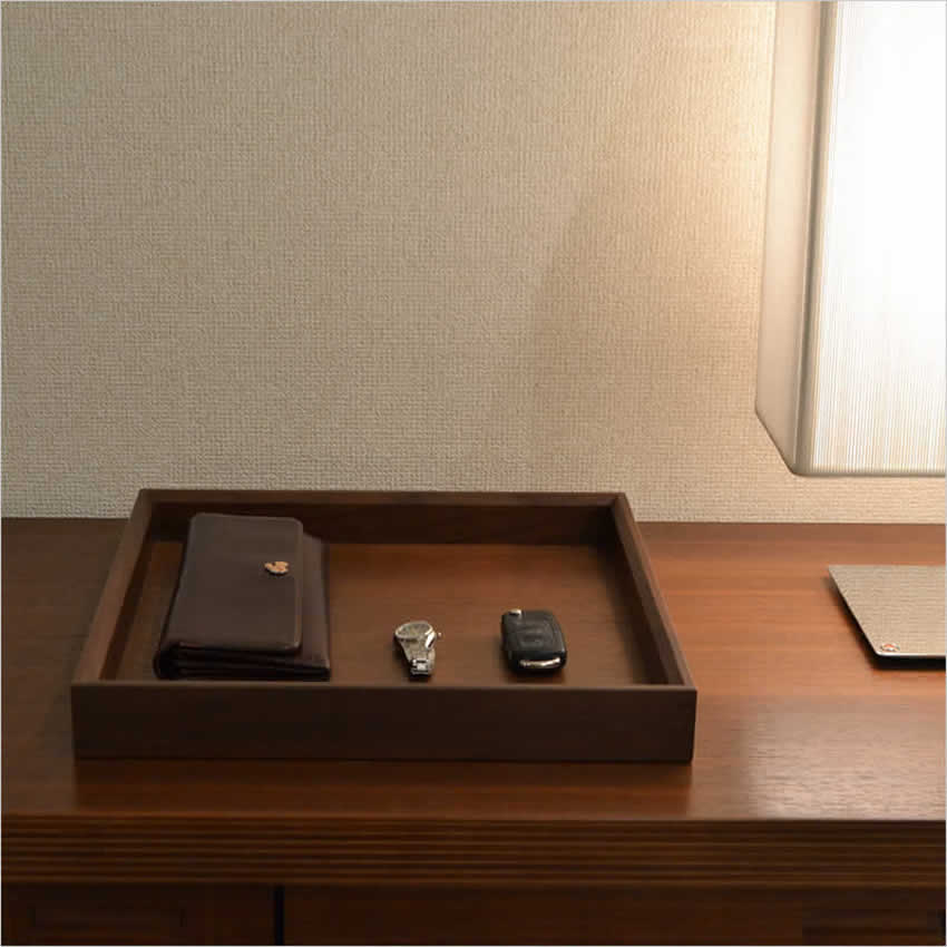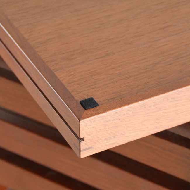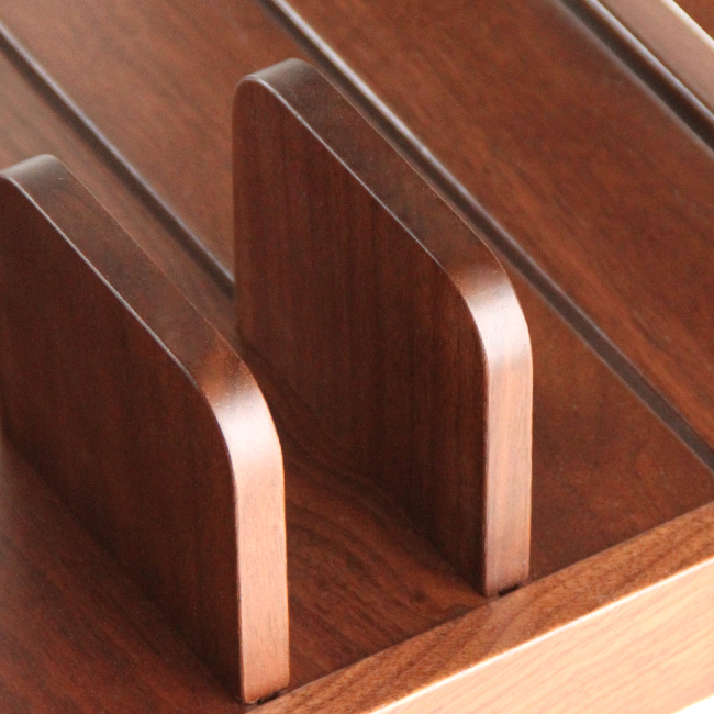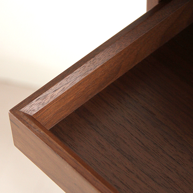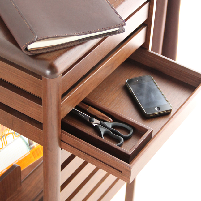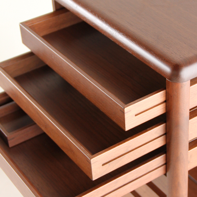 ルーバー状の意匠にも見える上部3段の引き出しは、トレイとして持ち出すこともできる仕上げになっています。