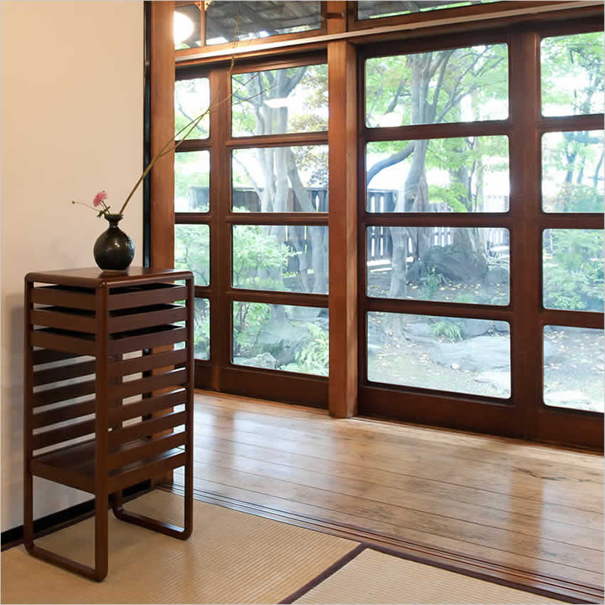 正面から見るルーバー状のデザインは、中に収納している本などを適度に隠し生活感を消してくれます。