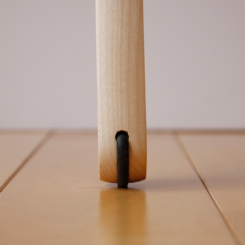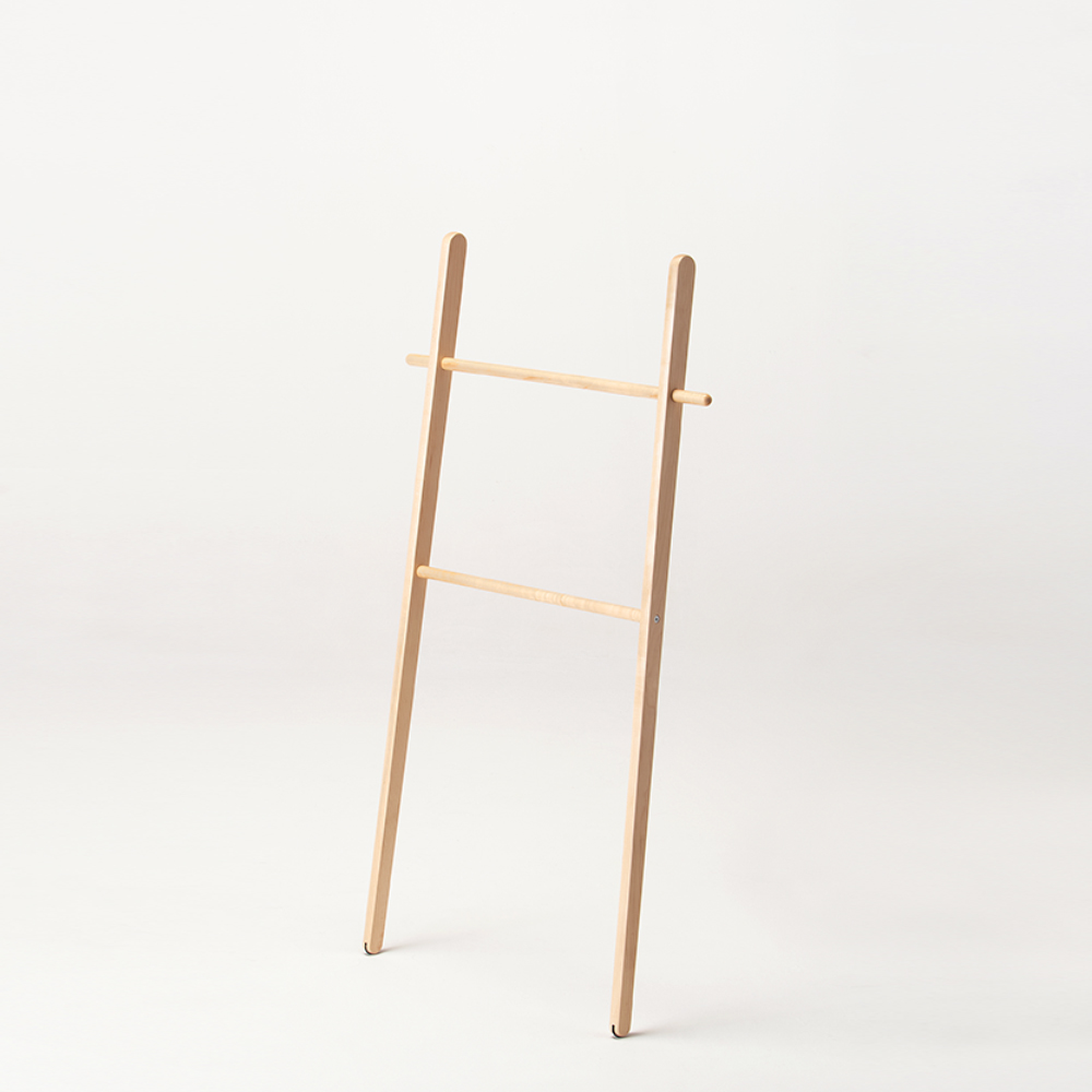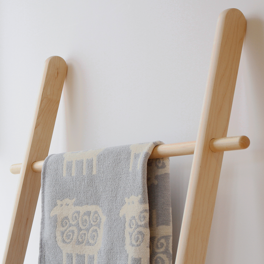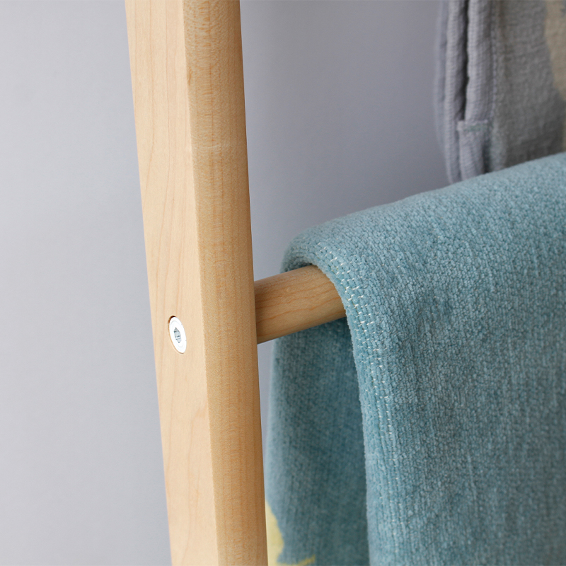 足元を壁から23cm離して壁に立てかけるだけでお気に入りのブランケットを見せて収納することができるので設置面積がとてもコンパクト。さらにウレタン塗装で仕上げているので、洗面脱衣所などでタオル掛けとしてもお使いいただくのもおすすめです。床と接する足先には滑り止めと床を保護する目的でゴムクッションを取り付けました。