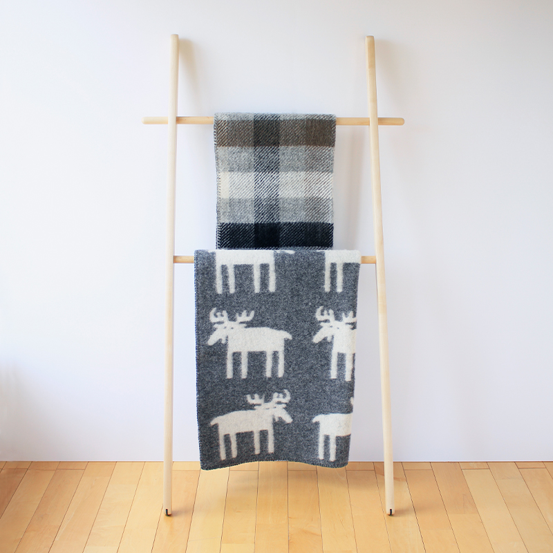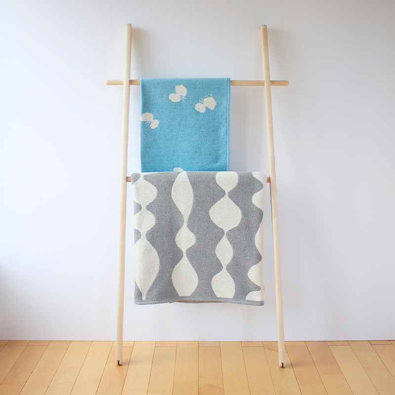 ブランケットラックは、リビングやプライベートなお部屋で使うお気に入りのブランケットを飾るように素敵に収納できる物があったら…というお客様の声をもとにラダーラックをリデザインして誕生しました。 ラダーラックの設置は壁に立てかけるだけ、軽量で必要に応じて楽に移動ができる魅力はそのままに、小さ目のひざ掛けなら2つ折り、お昼寝の時にも使えるサイズのブランケットなら4つ折りにして掛けられる幅としまいやすく取り出しやすいバーの高さにこだわってデザインしました。