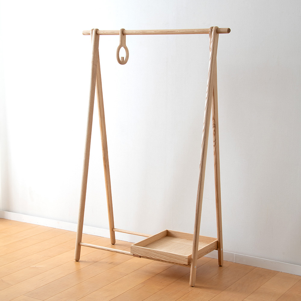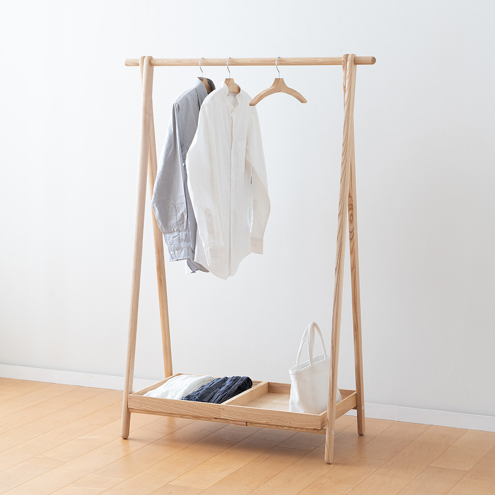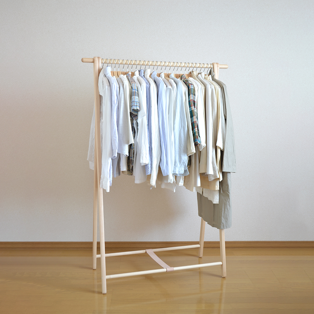コサインのハンガーで25着以上掛かる収納力と、たたんで移動できる身軽さ、どこに置いてもシンプルで飽きのこない美しいデザインと素材感が特徴です。