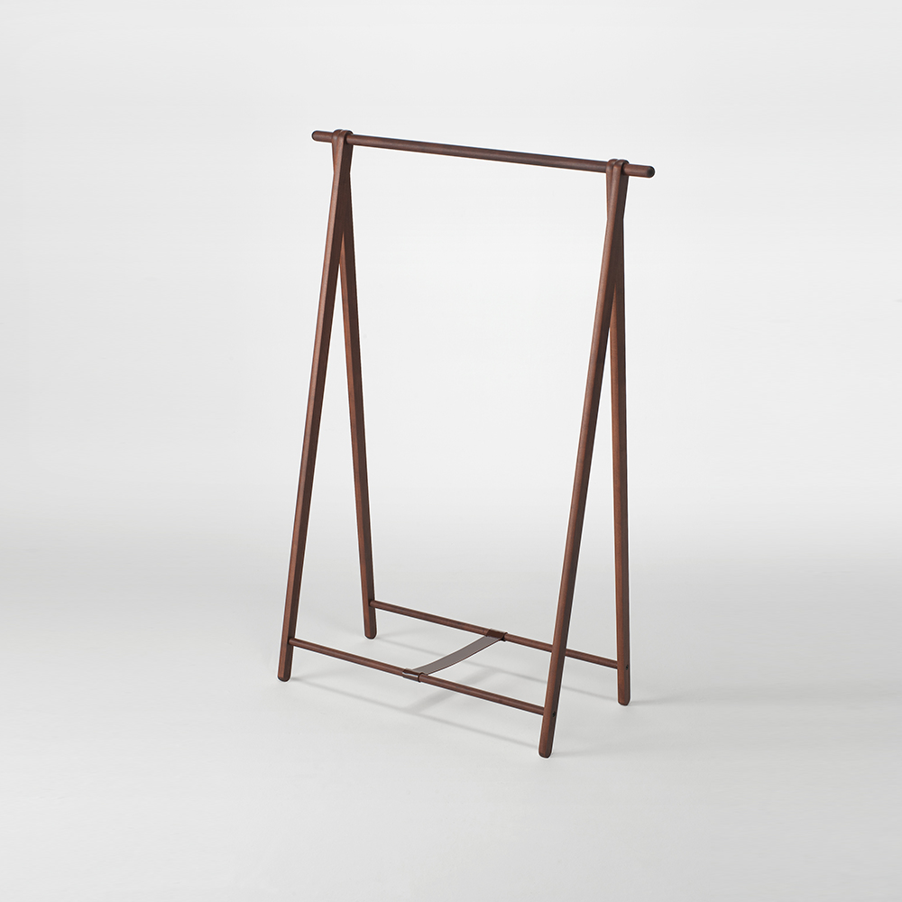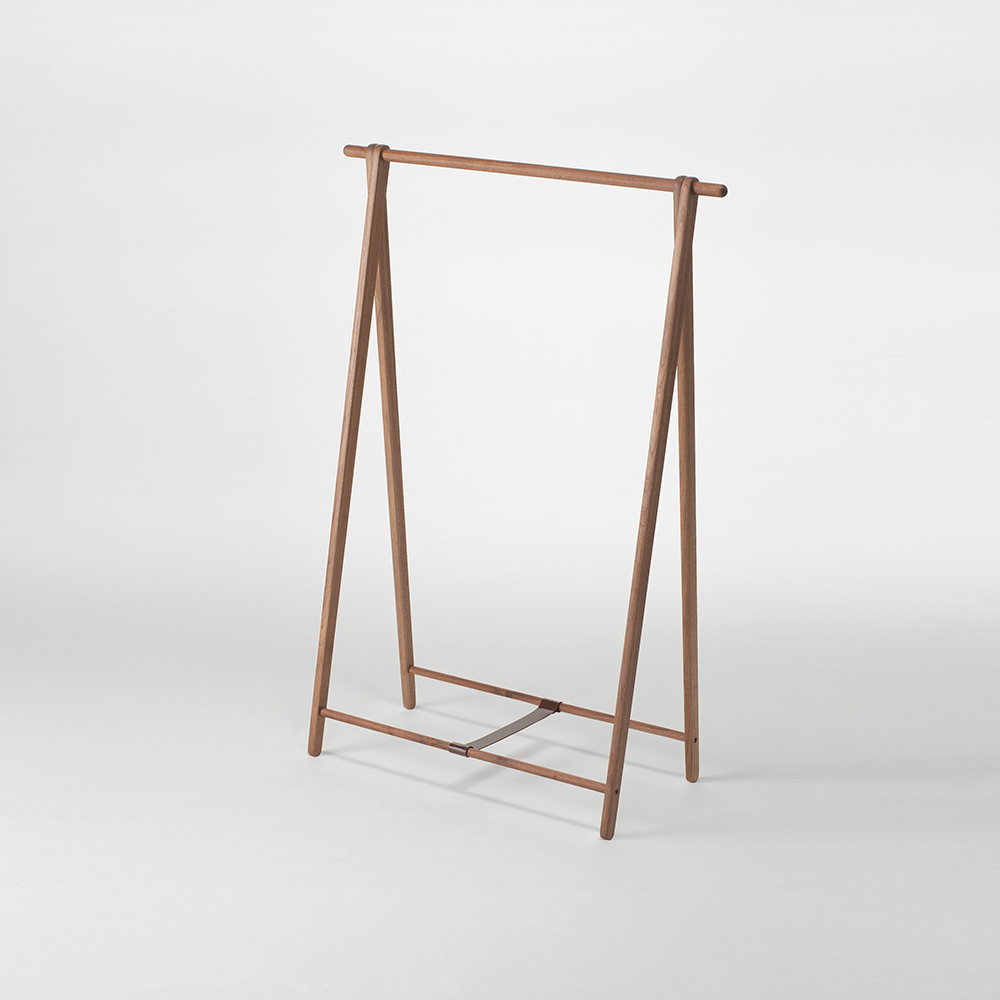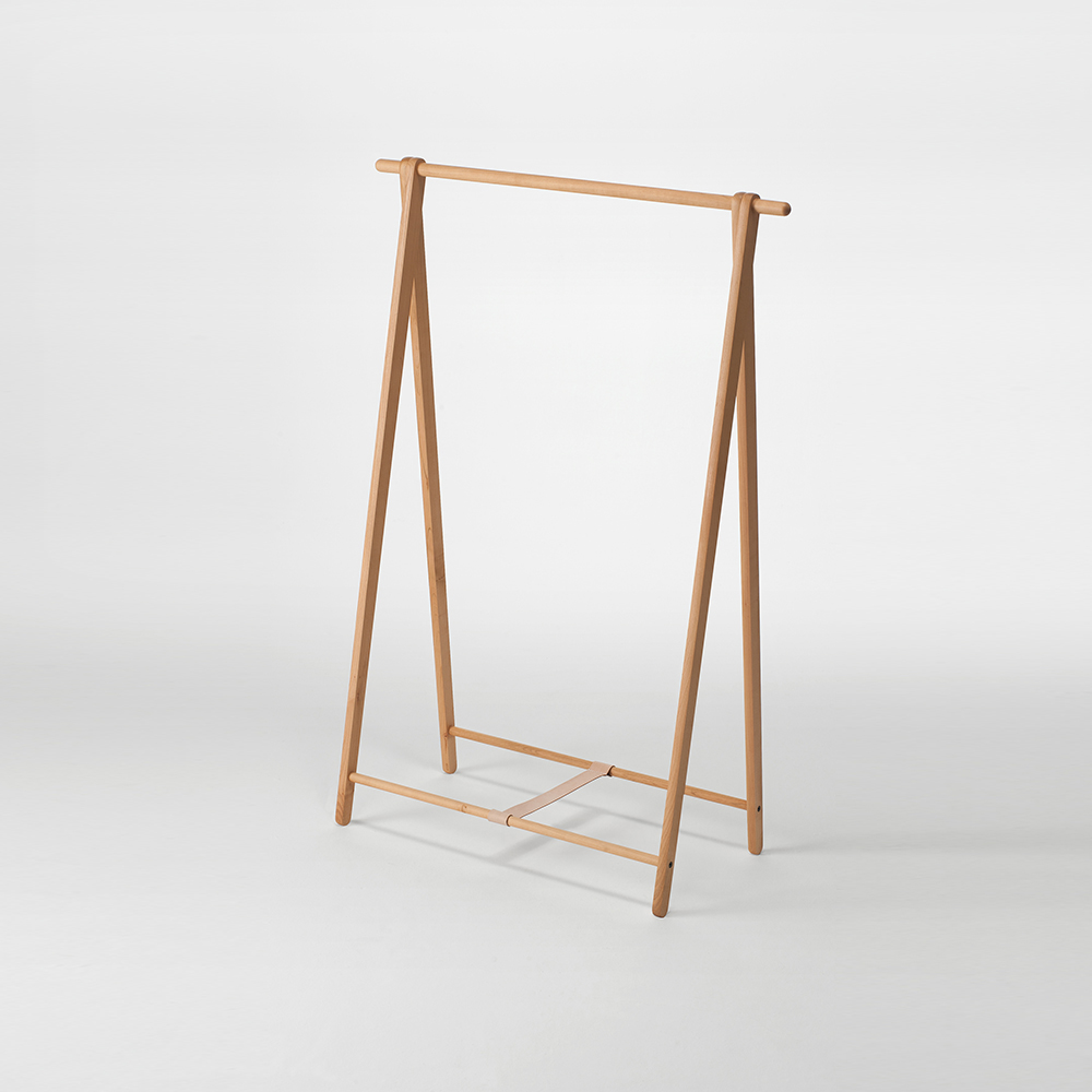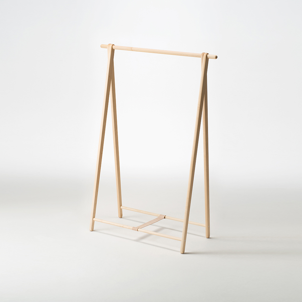 コサインのハンガーで25着以上掛かる収納力と、たたんで移動できる身軽さ、どこに置いてもシンプルで飽きのこない美しいデザインと素材感が特徴です。