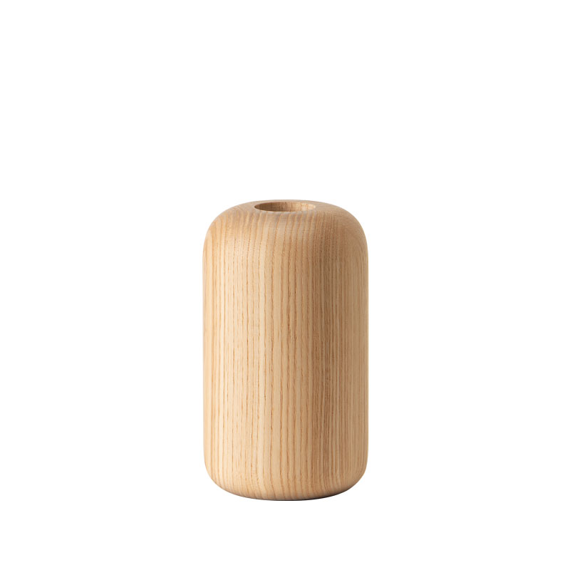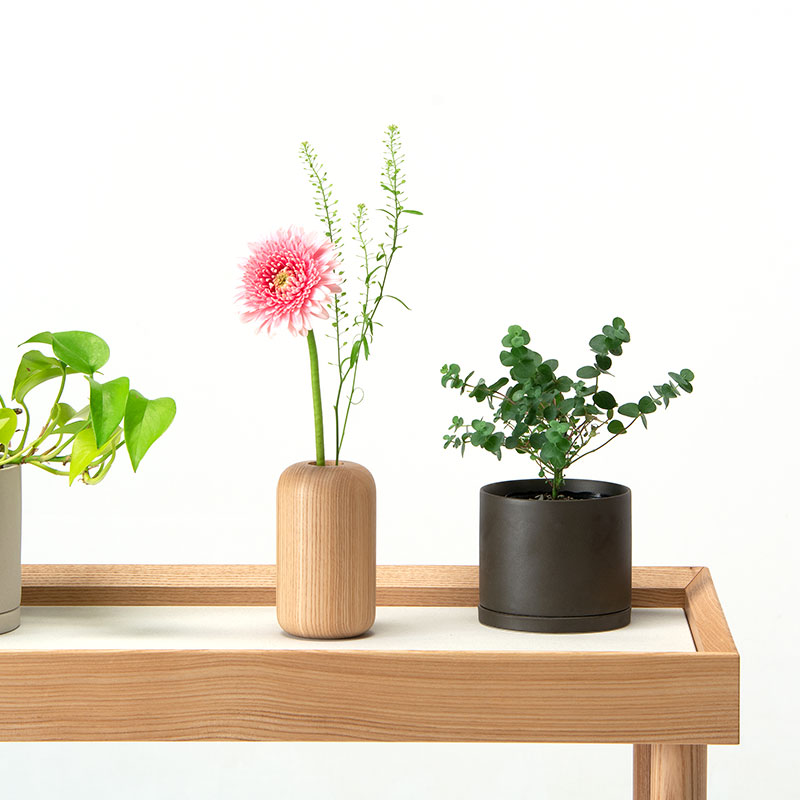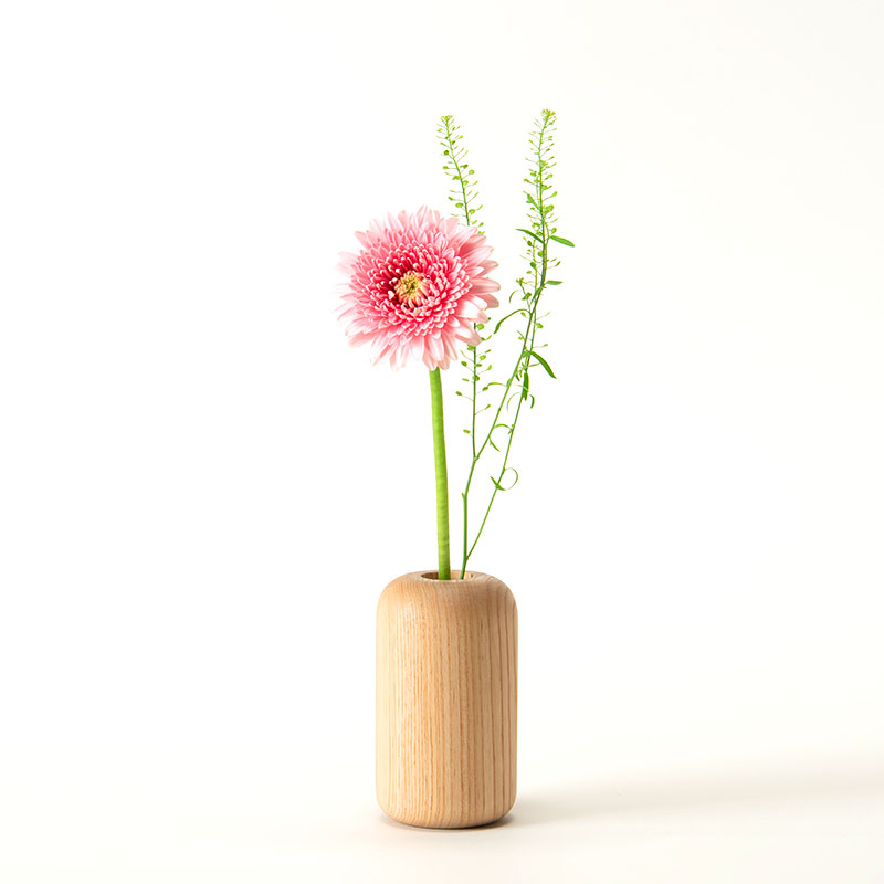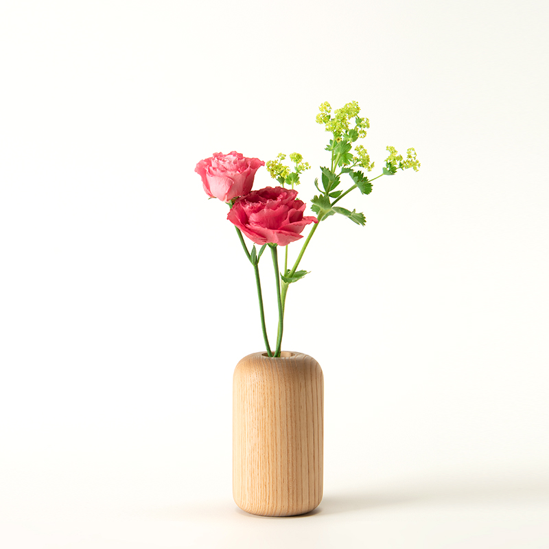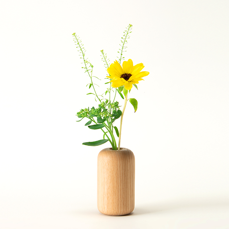 心が安らぐ柔らかな表情の一輪挿し。植物を自宅に取り入れたくなる、愛着がわくコロッとした形が特長。北海道産のタモの木目が美しく、木質感あるベースです。水気に強くお手入れがしやすいウレタン塗装で仕上げています。