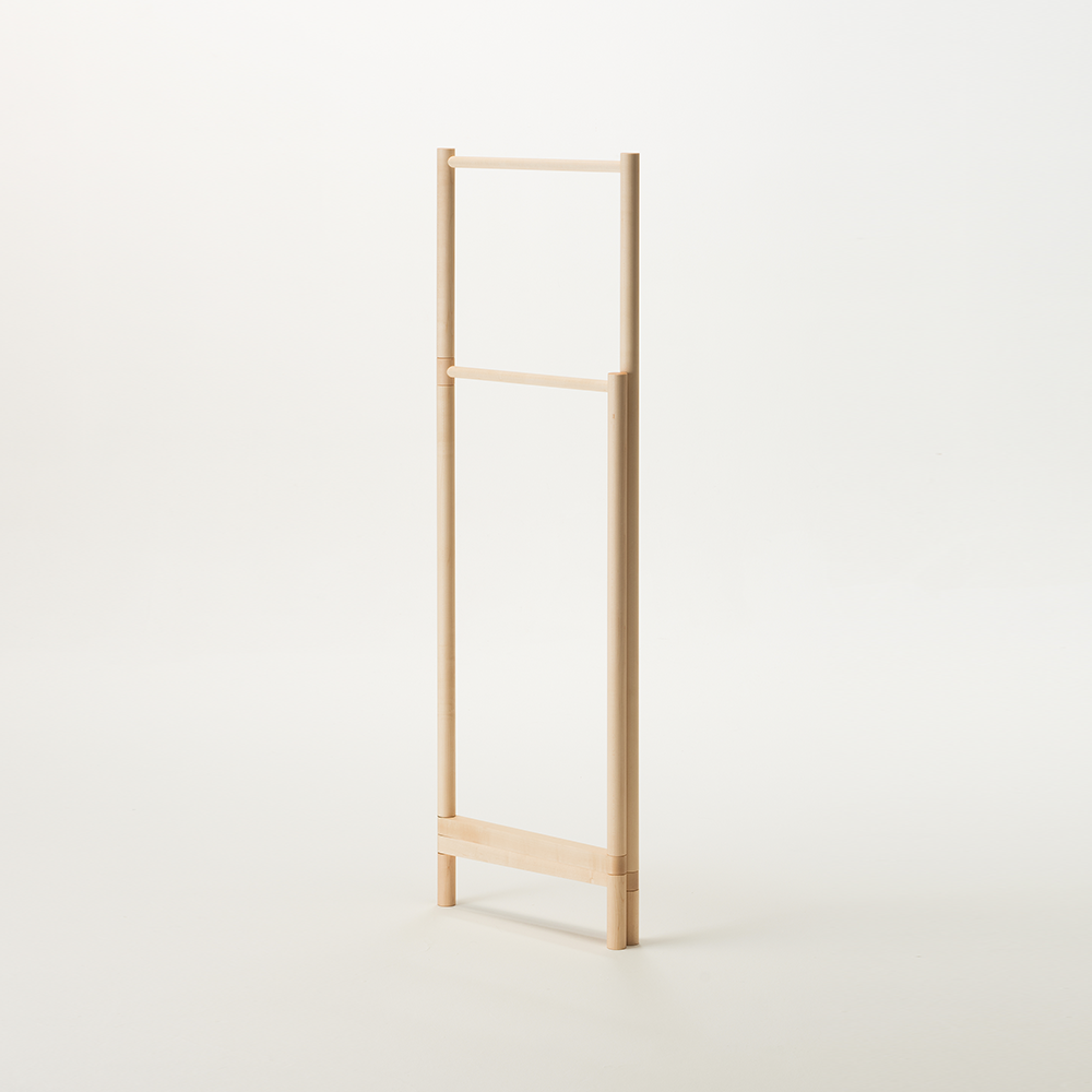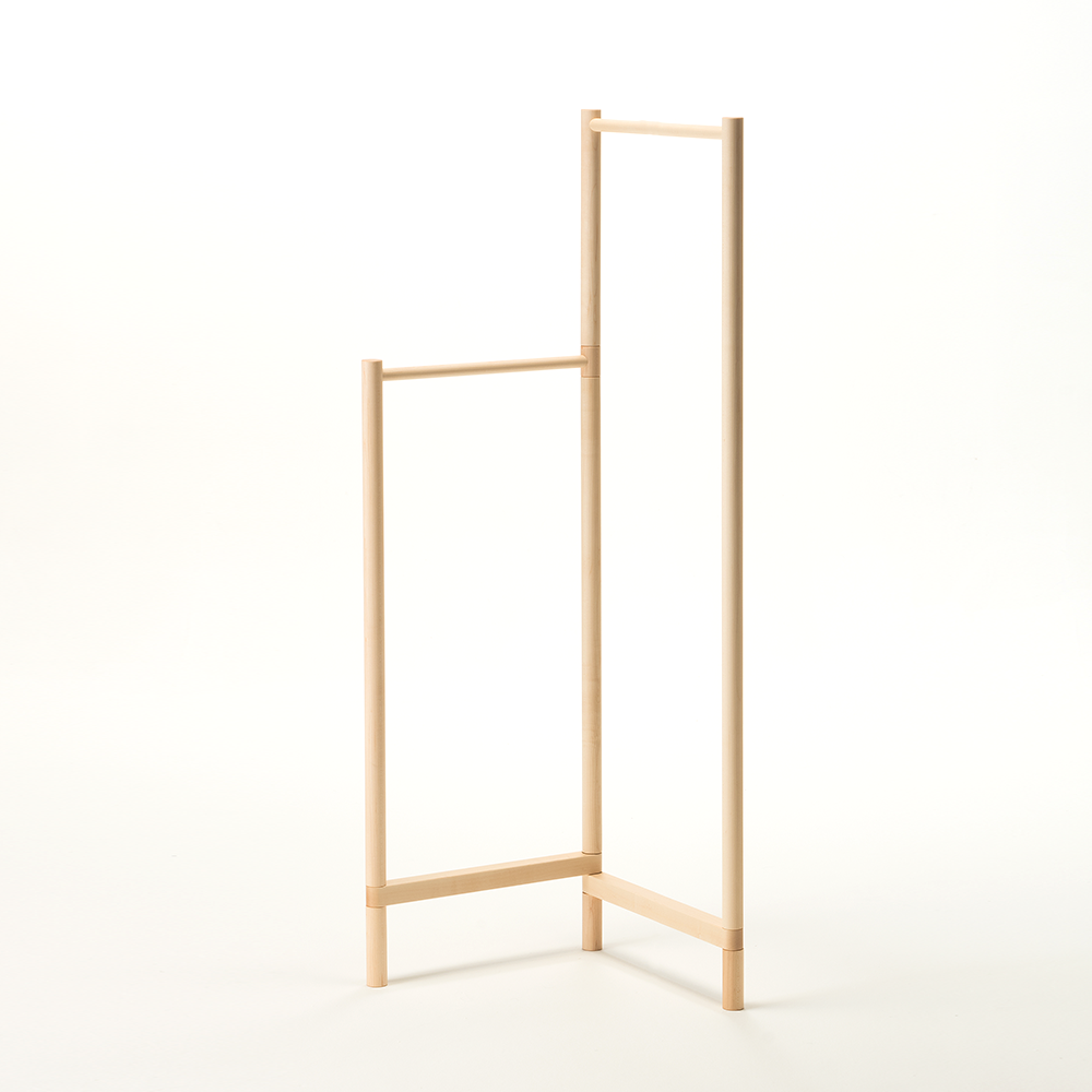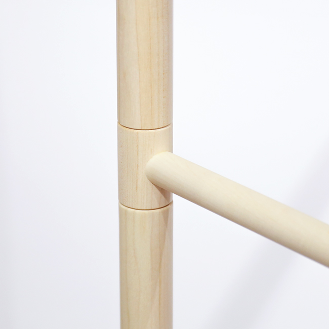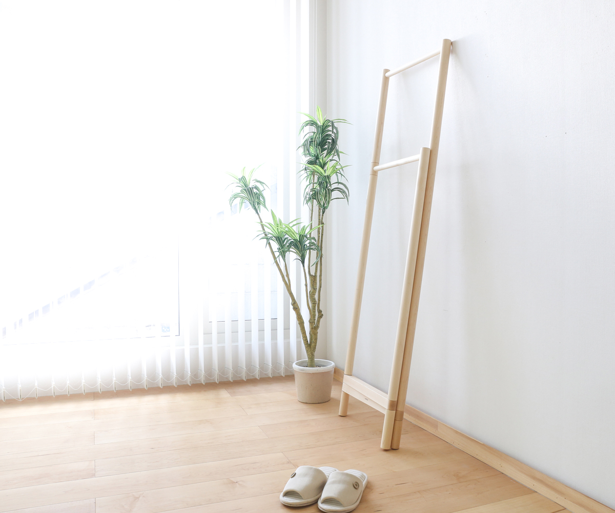 さっとアウターやバッグなどが掛けられるコンパクトな衣桁です。高さ違いの2連のバーは、圧迫感のない女性の目線ほどの高さと、ちょうど腰のあたりの高さの組み合わせで使い道はいろいろ。