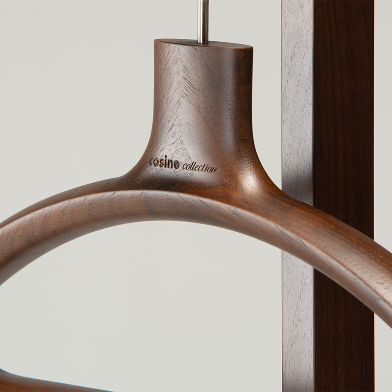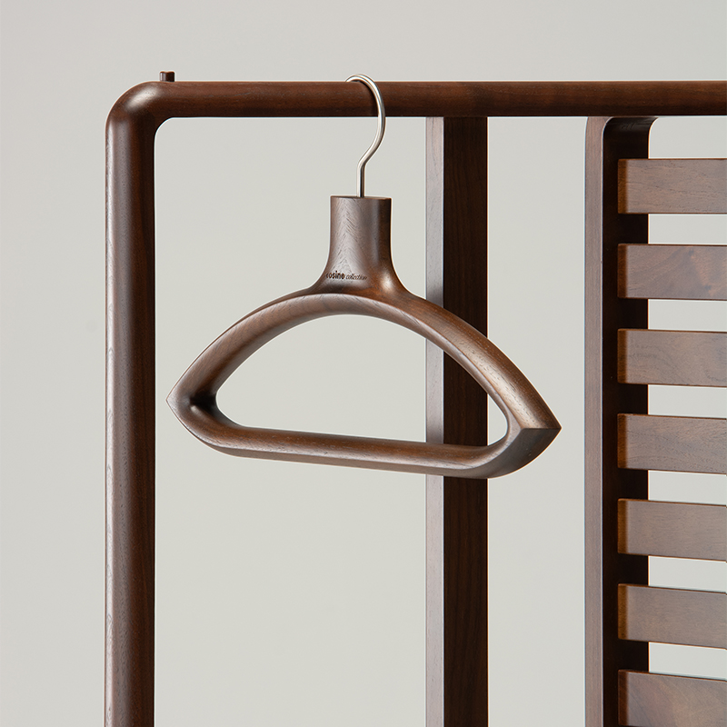 曲線が彫刻的な印象のairs ハンガー。加工精度と接着技術が求められるフィンガージョイント加工でつなぎ、彫刻的な曲線に削り出しひとつひとつ丁寧に仕上げました。