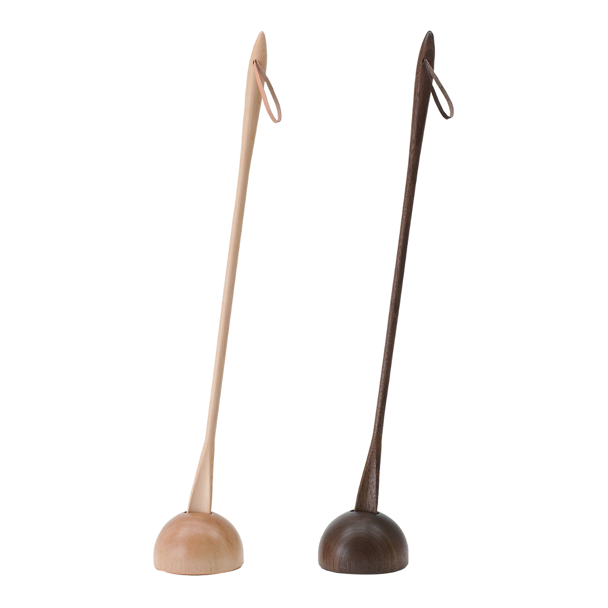 靴べら(L)と専用スタンドのセットです。 無垢材から削り出され、踵への当たりや滑り具合、持ち手の握り心地を考え抜いた靴べらは、彫刻を思わせるなめらかなフォルムに仕上がりました。 持ち手部分には牛革の革紐がついており、フックなどにかけておくのに役立ちます。木材も革紐も使い込むことで表情を変え愛着を増していきます。靴べら(L)は屈まずに使える長さです。玄関はお客様の第一印象が決まる場所です。だからでしょうか、新築祝いにも良くご利用いただきます。