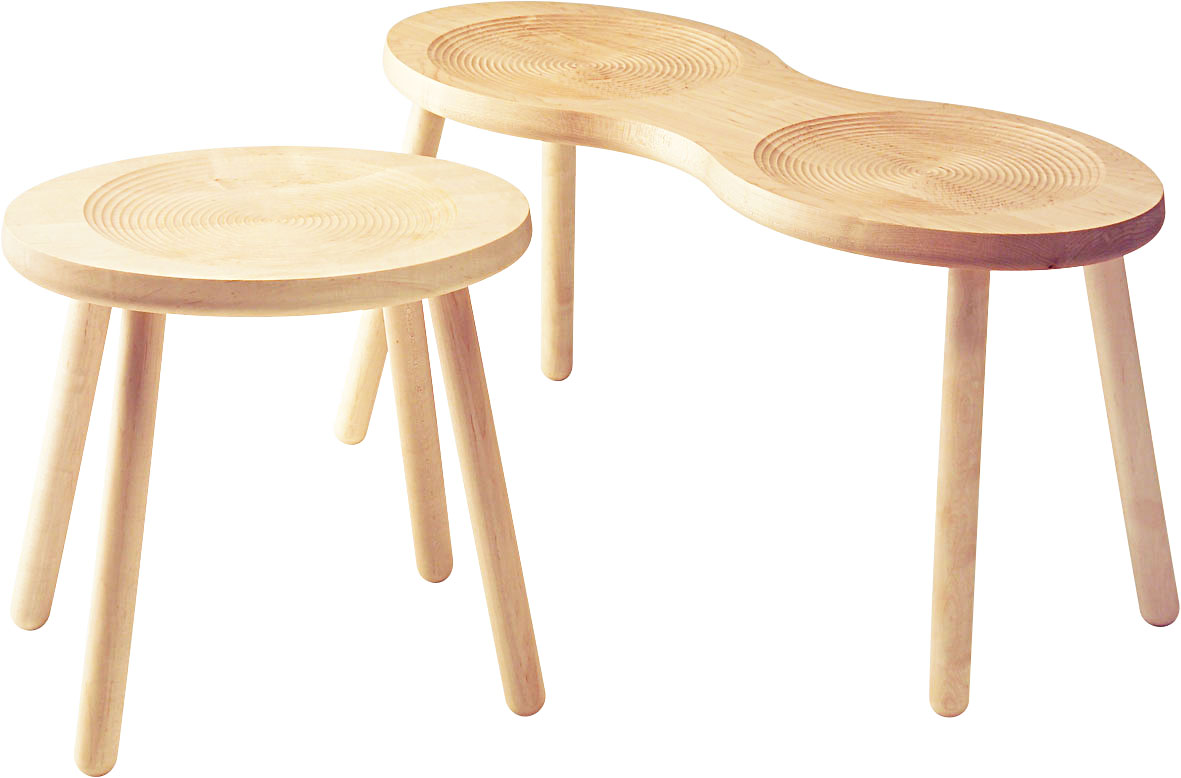 その名のとおり、お豆形の座面とぽってりした丸脚があたたかく、そこにあるだけで楽しくなるスツールです。