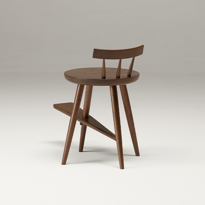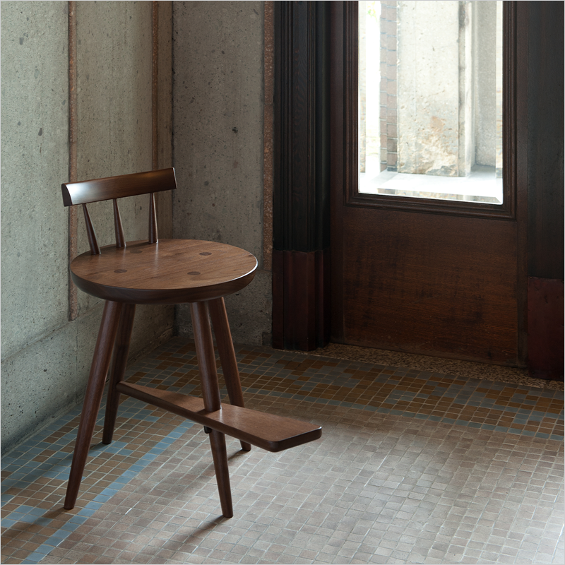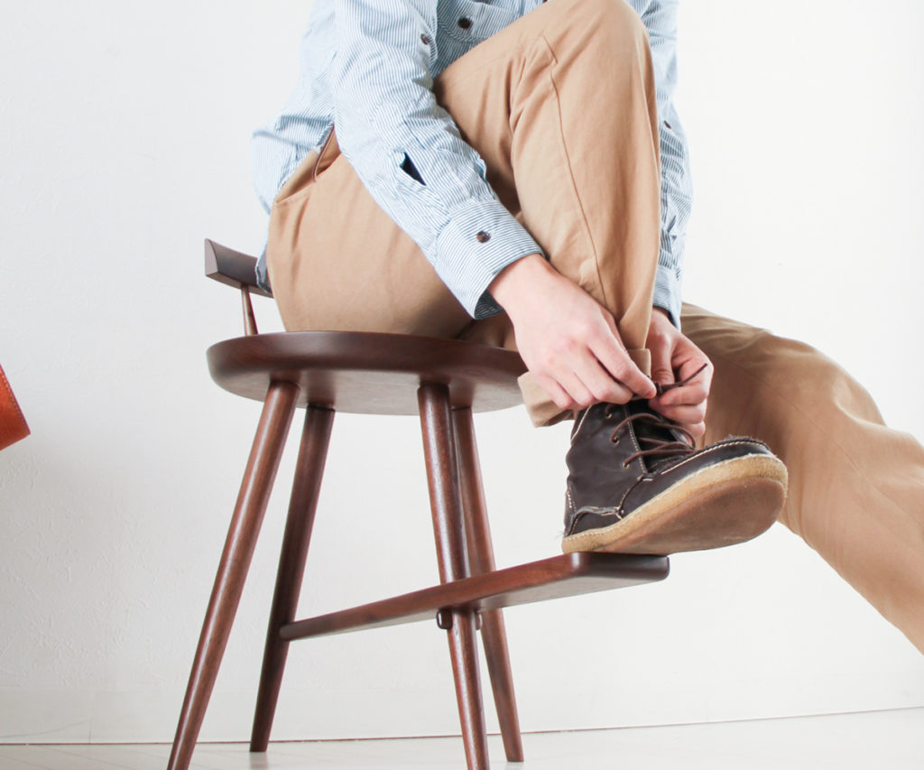 靴ひもを結ぶための足置きの「へら」を組み込んだ、少し座面の低いコンパクトな椅子です。