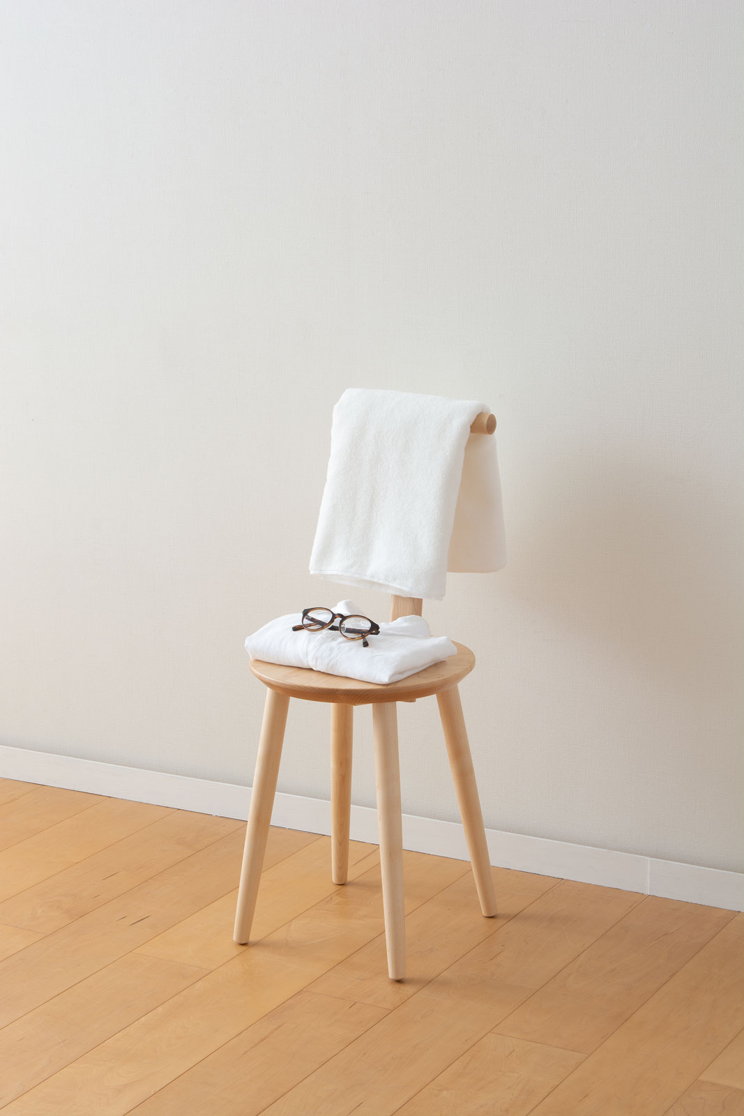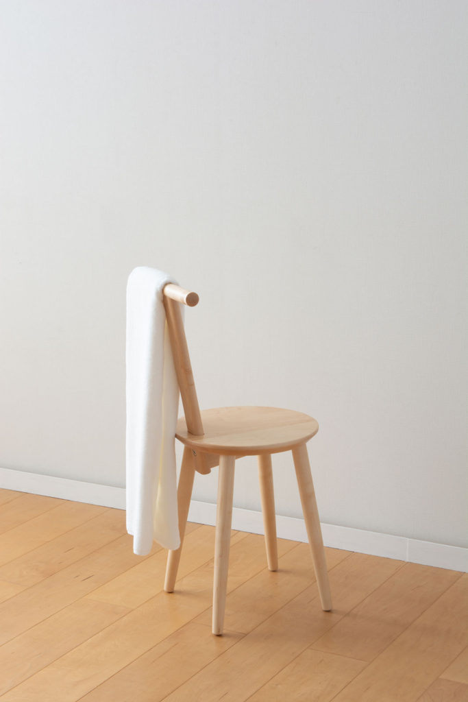 腰かけることと入浴時のタオルと着替えを置くラックの2つの機能を兼ねたTチェア。椅子として座るのはもちろん、T字の背もたれにバスタオルを掛け、座面に着替えを置くことで、入浴前後の着替えもスムーズに行うことができます。洗面台で髪を乾かしたり歯を磨いたり、座りながら着替えをしたりと、立ち作業が多い洗面室でちょっと座る場所があると身支度も作業も楽に行えます。