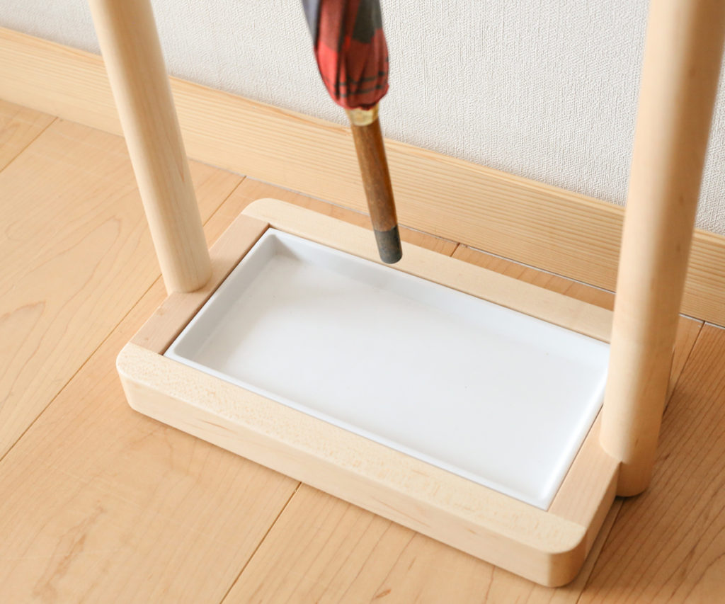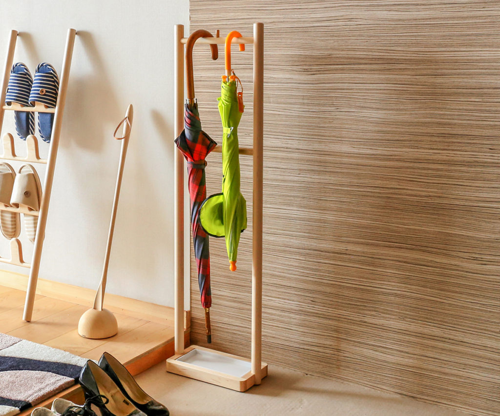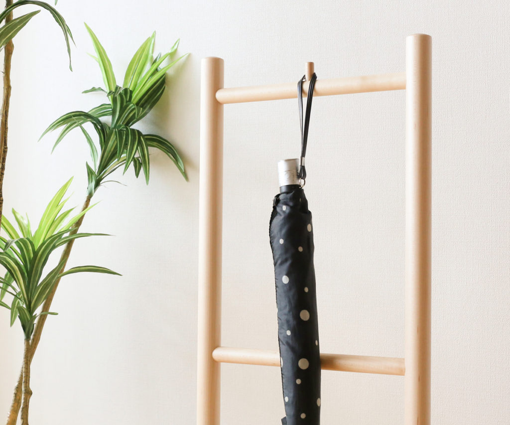 シンプルでありながら木のぬくもりを感じられる佇まいの傘掛けです。長傘はバーにそろえて真っ直ぐ掛けられ、置き場所に困る折り畳み傘もバーから出る突起に掛けられます。