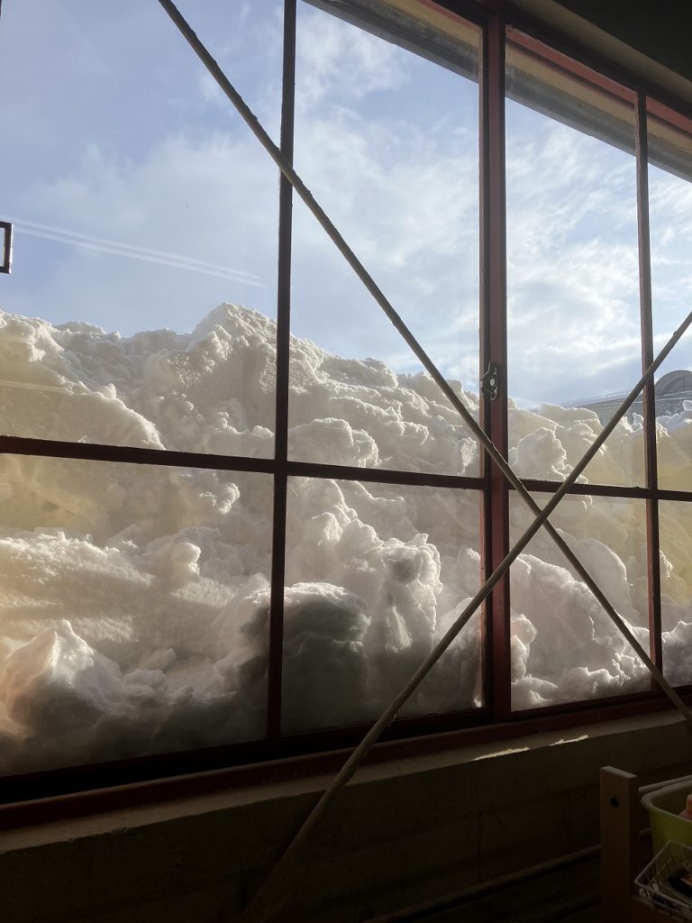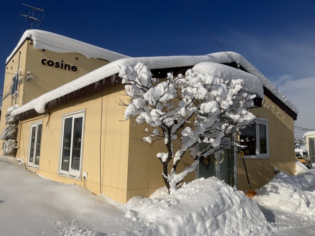 今朝の旭川は晴れ🌞。しかし、昨日からの雪が 20cm ほど積もり、久しぶりに手応えのある雪かきをしました!⛄💪 それに加えて、暖かさのせいか工房の屋根の雪が滑り落ち、窓をふさいでしまいました😅。コサイン旭川本店入口のイタヤの枝に綿のような雪が乗っています。自然はいつも上手に帳尻を合わせるものですね。