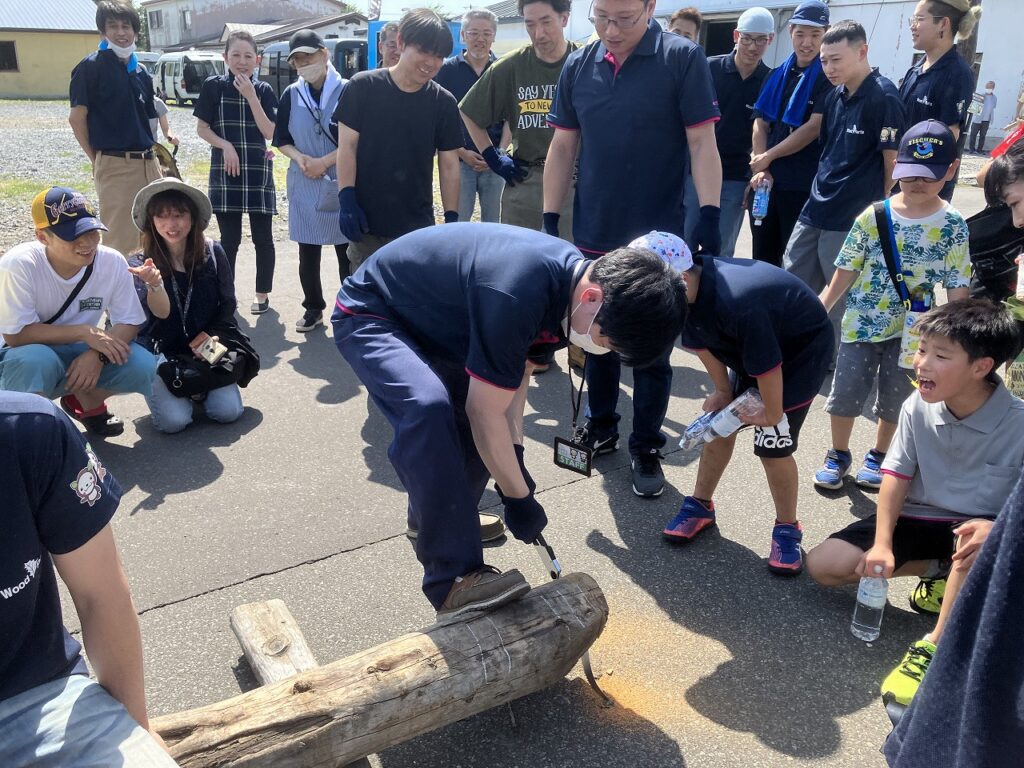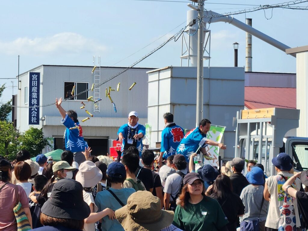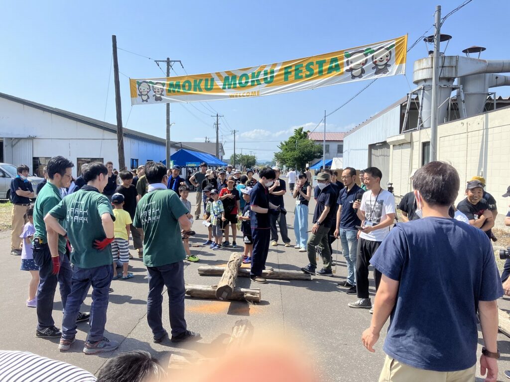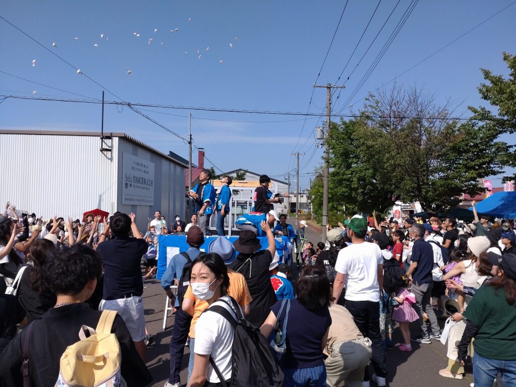 フェスタの見どころのひとつは、各社が本気で挑む 丸太切り競技。昨年はコサイン社員が優勝し、大盛り上がりでした。そして最終日には恒例の 餅まき。トラックの周りに大勢の方が集まり、子ども向け・大人向けと2回に分けて行われるため、笑顔と歓声に包まれる時間です。🥳