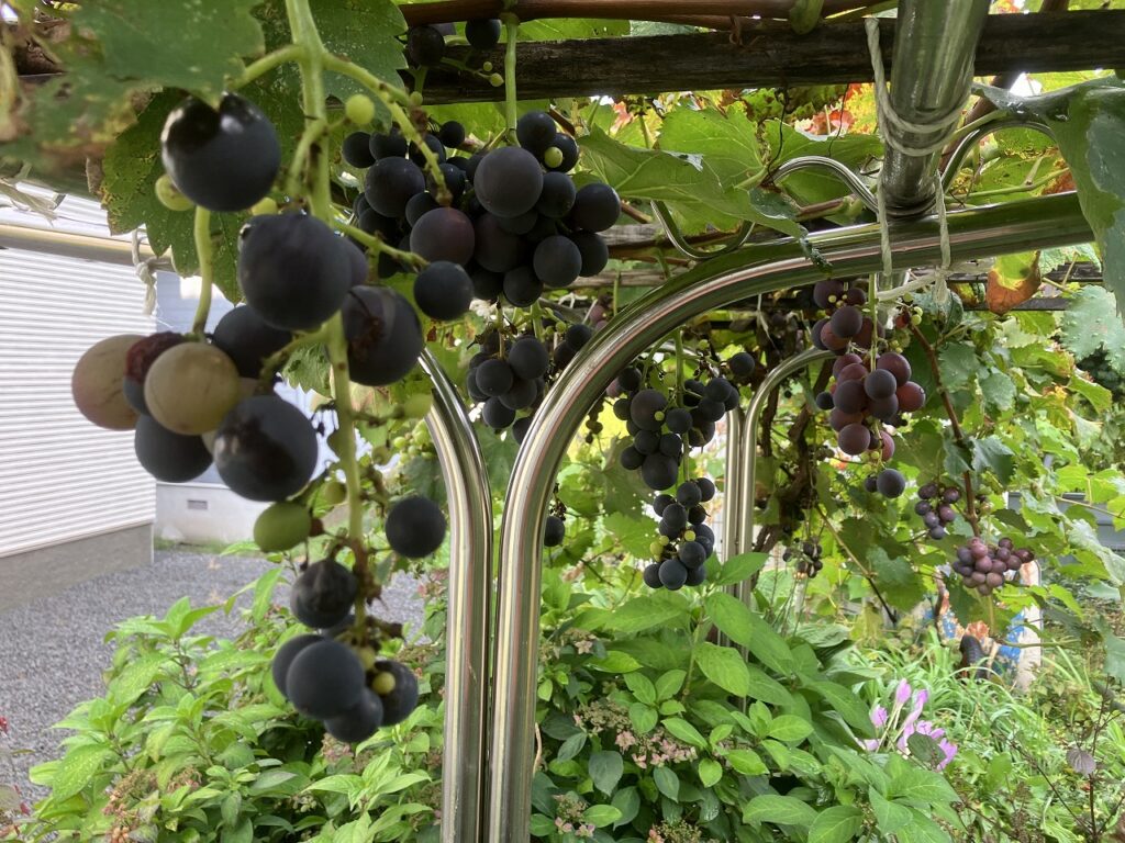 🍇 庭ではブドウが色づき、秋の花も咲き始めました。