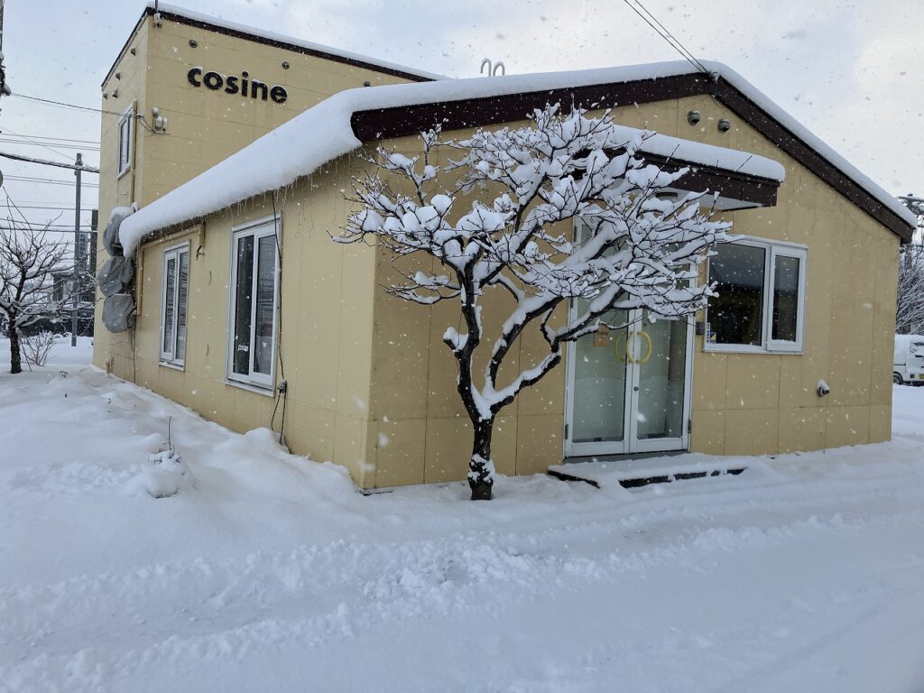 あたり一面が真っ白な世界の中で、コサインの黄色い建物は今日も元気に輝いています。