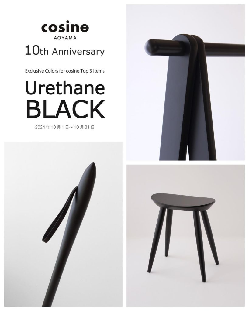 コサイン青山10周年を記念して、コサインのロングセラーアイテム「ドレスラック」「靴べらとスタンドのセット」「エントランススツール」に別注カラー「ブラック(ウレタン塗装)」を10月1日(火)より限定発売いたします。