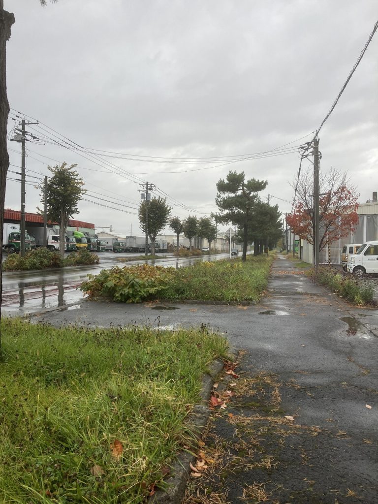 今日の気温は11℃から19℃へと上がり、終日雨の予報です。しかし、気温が高いため、雨は冷たく感じません。コサイン旭川本店の花壇は、秋を迎えたこの時期でも色とりどりの花が咲いており、訪れる人々の目を楽しませています。店の周りでは、紅葉したサクラの葉がアスファルトに美しく散り、隣接する緑地帯も秋らしい雰囲気に包まれています。季節の移ろいを感じる静かなひとときです。