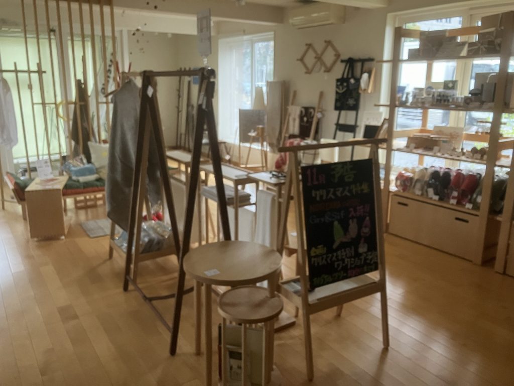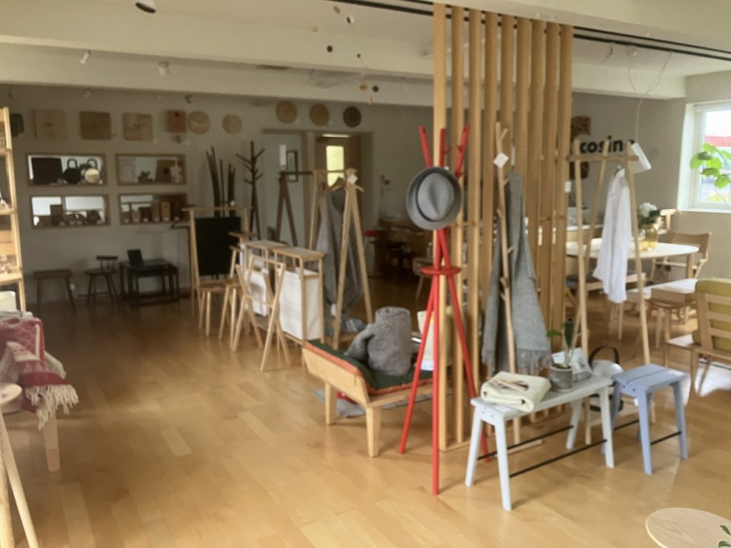 ショップに入ると、まず目に飛び込んでくるのはエントランス商品コーナー。新作のコートスタンドやシューラックが堂々と展示され、これからの季節にぴったりのアイテムとして、お客様の生活を豊かに彩ること間違いなしです。それぞれのアイテムは、シンプルかつ洗練されたデザインで、木の温もりが日常の中に自然に溶け込みます。