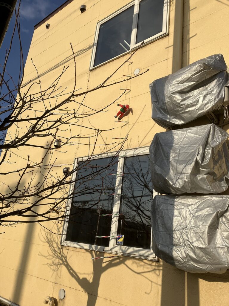 工房の外では、黄色い建物と冬支度をした桜の木が光を受けて、どこか嬉しそうにも見えます。