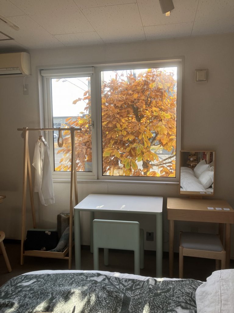 窓から見える黄色に紅葉したミズナラの木々は、秋の訪れを色鮮やかに伝えてくれます。まるで額縁に収められた一枚の絵のような光景が広がり、見る人の心を和ませてくれるでしょう。また、隣接する緑地帯には、寒さの中でも健気に花を咲かせている植物たちが見え、その生命力に元気をもらいます。