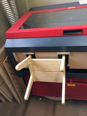 コサインの工房の一コマ。レーザー機により製品に、製品の品質を約束するロゴ「cosine」を入れて居ます。場所によって焼印、シルク、シールで入れて居ます。お客様の中には、シールでがっかりしたと言う声を聴き、出来るだけレーザーで出来るように工夫して居ます。今朝も子供椅子の背にお子さんの名前をレーザー機を苦しして入れて居ました。