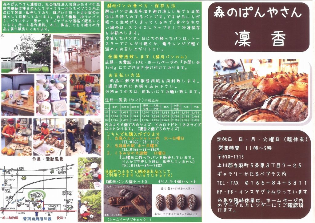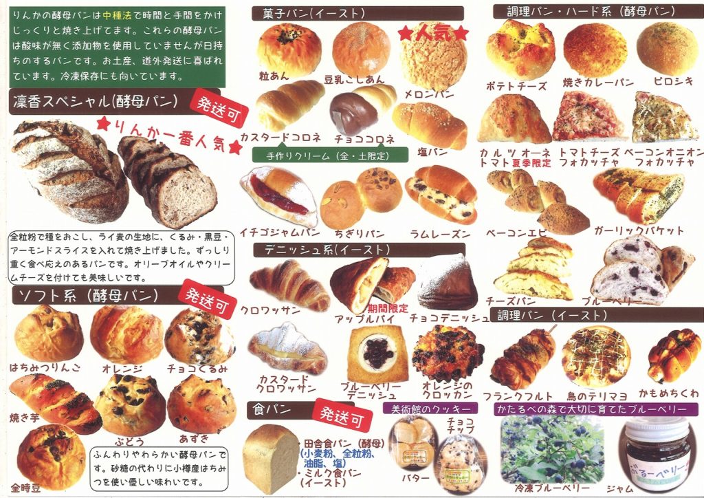 5月も最終を迎えようとしていますが、コロナ騒ぎも納まるところを知らない状態。なんせ、初めての事で国を司る人も私達も戸惑う事ばかりです。不安ばかり煽られ「大丈夫!」と言える事が見えずに居ます。それでも、オリンピックは開催する。中止すると、大変な負担が国民に課せられると聞きます。今は、出来ることをやり、結果を得ていくしかありませんね。 緊急事態宣言、不急不要な外出は控える中、妻と近隣の町当麻町の「森のぱんやさん凜香」行って来ました。少し迷いましたが、当麻中学校に隣接するギャラリーかたるべプラス内にありました。 中種法で作る酵母パンは、味わい深く、酸味が無いのが特徴。その他にも、菓子パン・調理パンなど、約45種類のパンを、バラエティ ー豊かに、リーズナブルな価格で販売。パン工房は、メンバー3名、スタッフ4名で活動しておりま、2002年よりオープンして居たとか。先日チラシで知りました。 日、月、火曜日が定休日、営業時間11時〜17時。