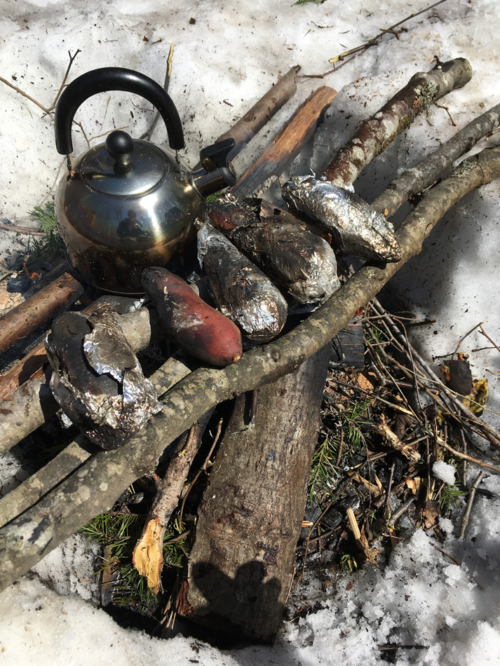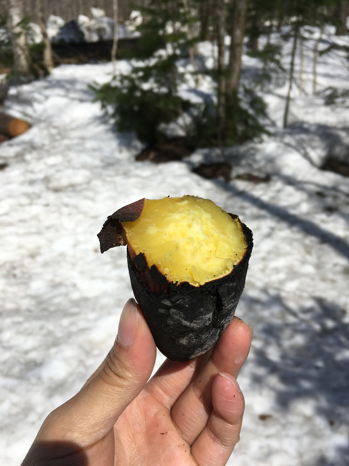 樹液は1滴ずつ貯まるので、 その間に焚き火をしてマシュマロやお芋を焼いたりして楽しみます。子どもたちは辺りを探検します。