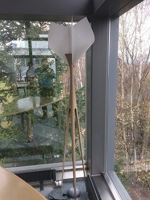 昨日、補助金の相談に中小企業基盤整備機構が事業主体となり、旧「頭脳立地法」に基づく特定16業種、「企業立地促進法」に基づく旭川地域の基本計画における指定集積業種、企業内の研究開発・情報処理・商品開発部門など特定事業立地の受け皿となる中核的業務用地として整備された、旭川リサーチパーク内にある旭川産業創造プラザに伺いました。三密を防ぐためにと、交流サロンでお話を伺いました。そこに入ると、弊社製品の照明器具がそれぞれコーナーに置かれて居ました。この製品、fioretto(フォレット)シリーズの中のランプです。コートスタンドと同じく、鋳物のウエートを使い、ウエートを吊っているワイヤーに触れると電気の入り切りから照度調整も出来ます。施設が出来て28年経過していますが、今だ健在でした。ちなみに、デザインはプライムデザインオフイス蛯名紀之氏です。コサイン創業当時よりデザインをお願いし32年を経過した現在においても、お客様より支持していただいて居ます。これも、昭和の一節です。