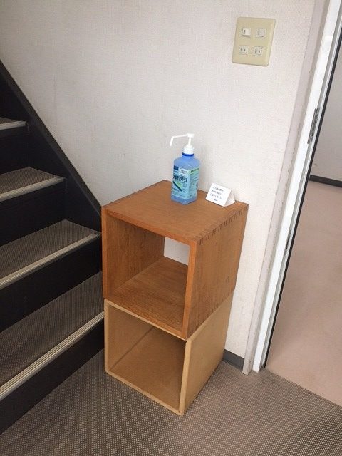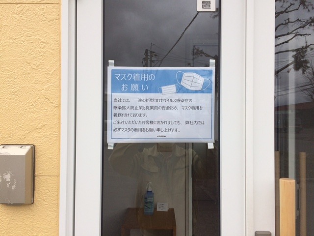 ウィルスの感染拡大予防対策として、ショップのクローズを始めとし、事務所、工房の出入り口にはマスクの着用をお願いしております。また消毒薬も設置しています。さらに、出来る範囲での作業域の確保等を行い2時間ごとの換気も行って居ます。