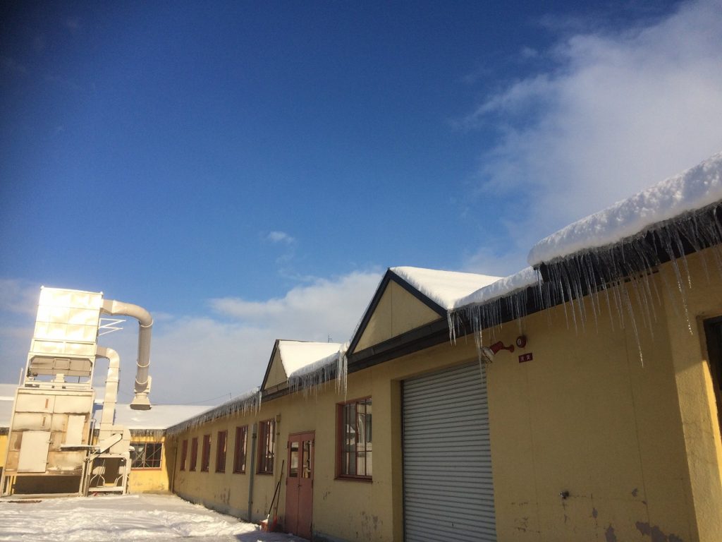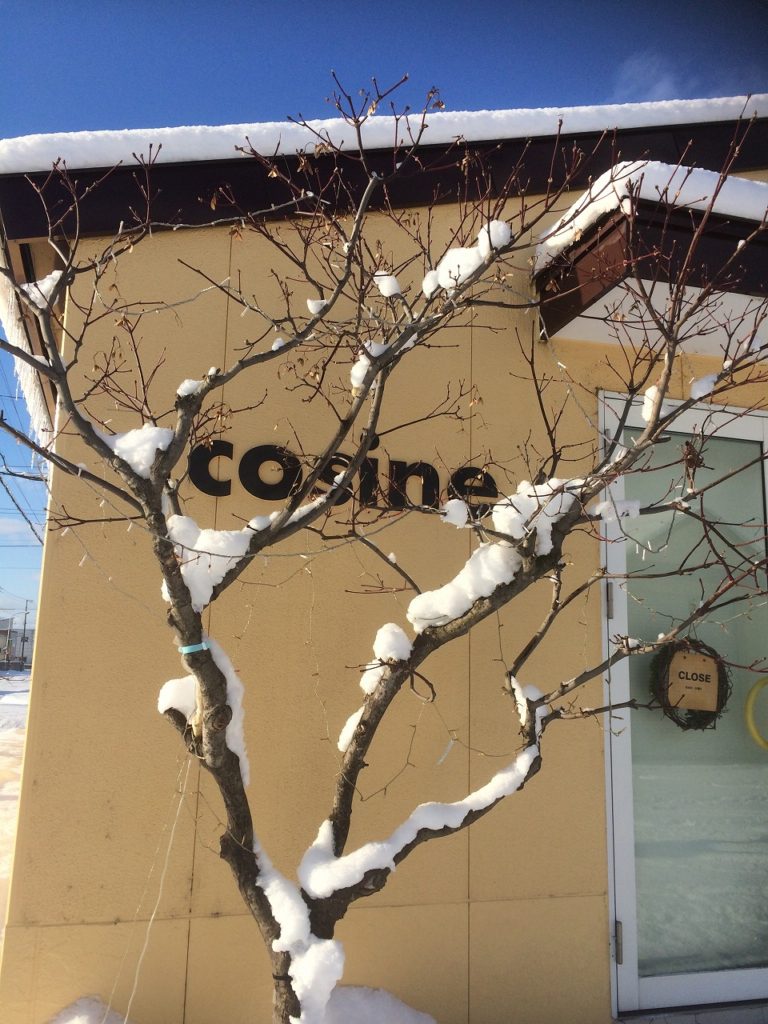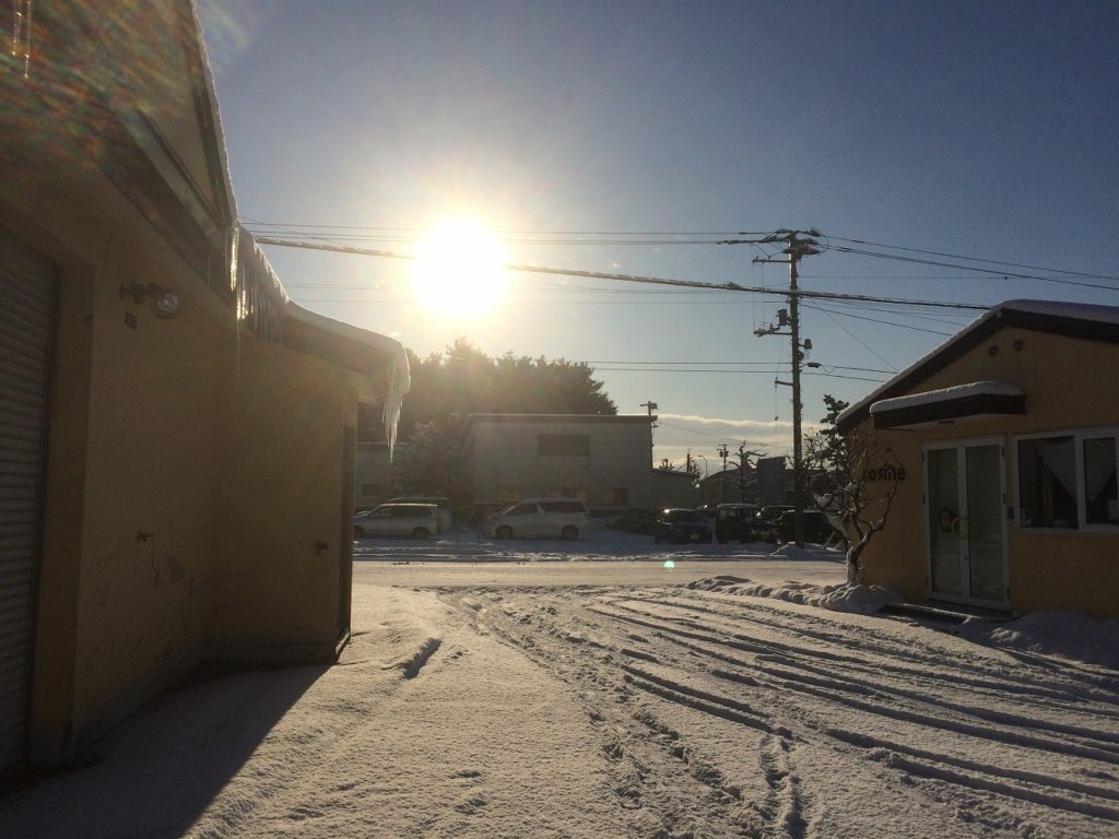 すっかり銀世界になったでしょ。建物の黄色が似合っていますよね。屋根から下がったツララも朝日に照らされ輝いています。日が暮れるとイタヤの木のイルミネーションも点滅します。水曜日はショップは定休日です。