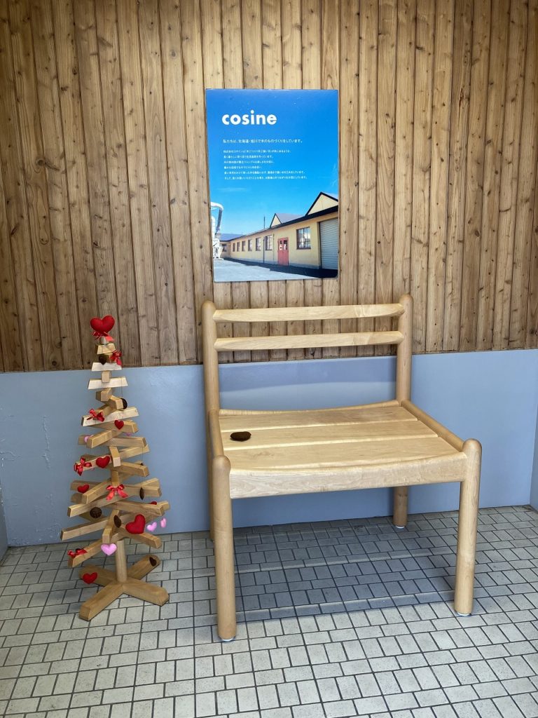 今日の日中の温度がプラス4℃の予報です。暖かいと屋根の雪が融けて締まり、見た目より重たくなります。こんな日の雪下ろしは危険が伴います。 暖かいので、氷柱花も凍りきっていませんが設置して見ました。自宅前を通る方々に楽しんでいただければ嬉しい。 コサインにも来ていただいた方に楽しんでいただけるように、ツリーやビックチェアを作り設置しています。2階の事務所に登る階段周りにも絵、写真、モビールを設置しています。社内社外の方にホッコリしていただけるかな。 正面の油絵は、デザイナーの蛯名紀之氏がコサイン創業時に描いて寄贈していただいたものです。創業当時にデザインしていただいた製品が今も売れ続けているロングラン製品が多数あります。