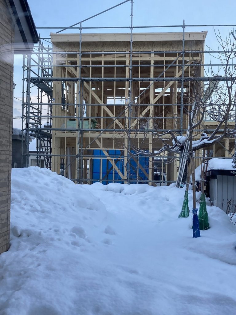 今朝は、青空が広がる朝を迎えています。日中は-3℃と暖かくなります。自宅裏の住宅も日に日に仕上がって、構造が見られるのは楽しい。38年前に住宅を建てましたが、工法もすっかり変わっています。 その時は、建前を行い餅まきもしました。その際に、住宅の骨組みをぐるり見て回ると、何と1か所間違っていて、傾斜しているところを発見し、責任者に伝えましたが、そもそも責任者が気が付かない事にビックリ!したのを覚えています。正面から見てはいけない、斜めから見ると傾斜など良くわかると聞いたことがありました。