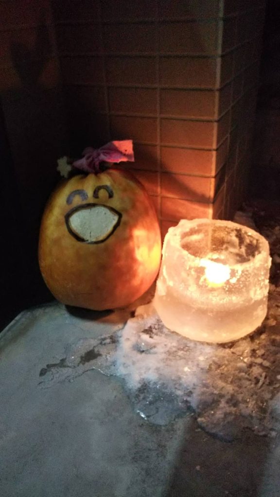 LINEで、初めてキャンドルを作りましたとメッセージを頂きました。かぼちゃと一緒に玄関先に置かれ楽しまれていますね。今朝も、コサイン旭川本店入り口のキャンドルは雪をまとっています。自宅でも造花を入れた氷柱を作りました。立春を迎えたので、暖かくなって行くので冬を満喫しましょう。