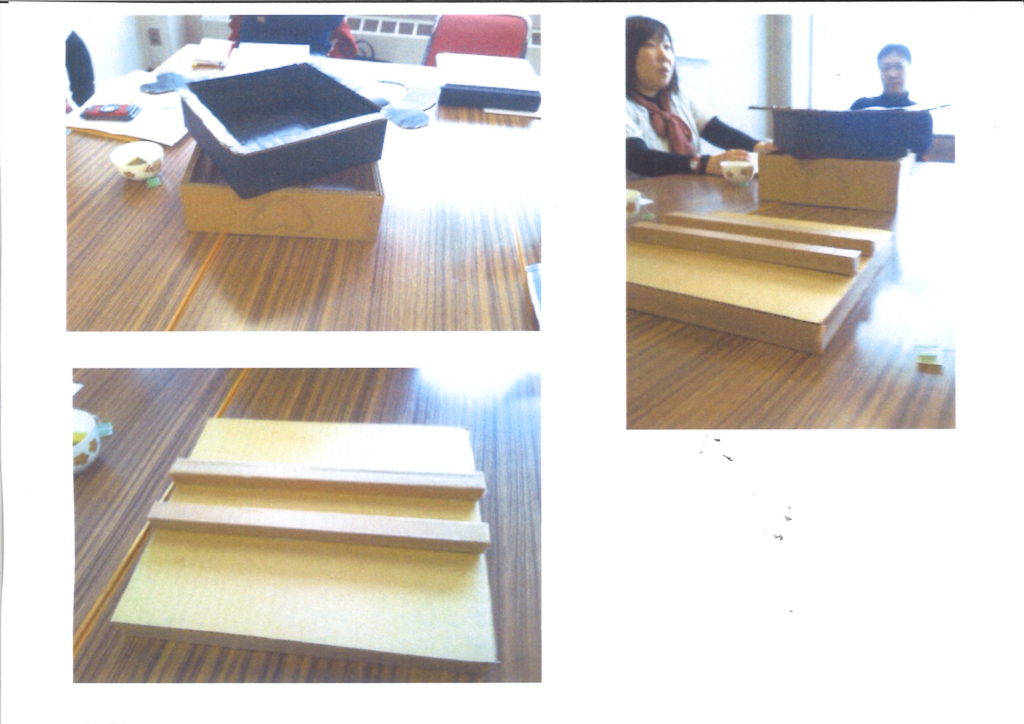 内 容:前回の会議での決定を踏まえ、段ボール工作で実寸大の模型を作り、寸    法、仕様等の検討を行った。