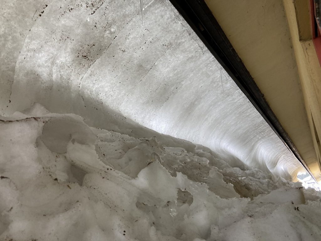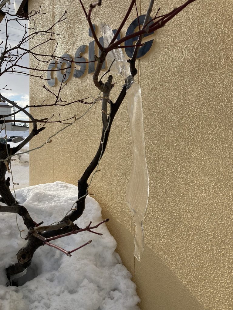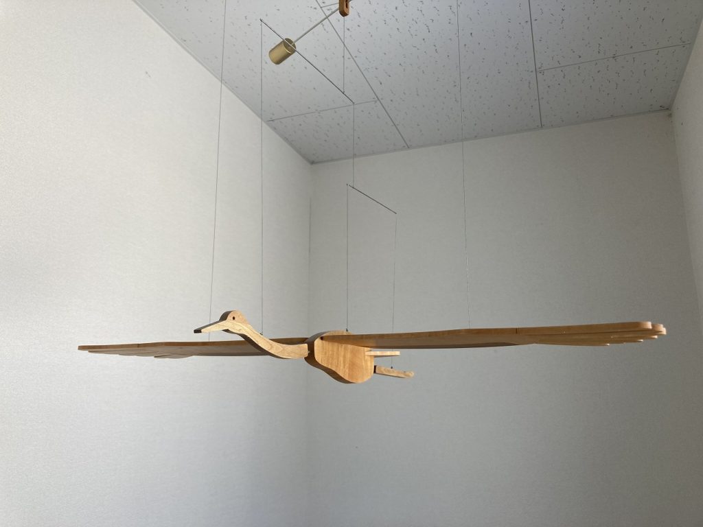 早朝から雪が降り出したので、「まだ降るの~!」って見ていましたが、すぐに落ち着き青空が広がって来ました。日差しも暖かく感じる様になりました。また工房の屋根の雪がドーム状になっていたり、ツララが思わぬところにできたりするのも春の訪れを知らせる様子です。季節が変わる中、変わらないのが2階の事務所にあがる階段上に吊るされたモビール作家早見賢二さん作のツルのモビール。