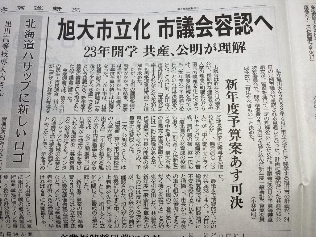朝刊の地元上川版を中心に見て朝食。7時15分からBSで始まる「澪つくし」を見、続けて「おちょやん」を数分見て出社。そんな日々、雪融けも進み気遣いも減ってきました。真冬は、枝道から本線に入るのが容易ではありませんでした。今朝の朝刊に、「旭大市立化 市議会容認へ」の見出し、また一歩進んだ・・・。市立化を待ち望んでいる学生、家族のためにも一日も早く決まってほしい。