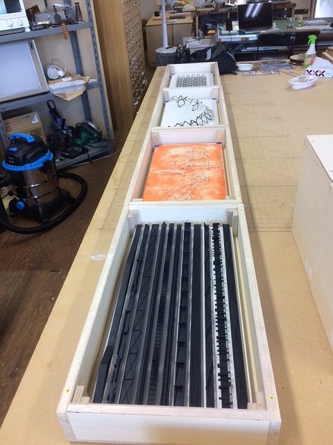 伊賀さんのアトリエにお邪魔させていただき、作品の数々を拝見させていただきました。どうすればこのような発想ができるのか・・・。だからアーティストなんでしょうけどね。さっそく、伊賀さんにコサインで日々製品を作る際に出てしまう材料(資源)を使い切る事ができないだろうかから、短材、片材を活かせるレリーフを考えた事などお話をさせていただきましたところ、想いを共有していただけ、わくわくした時間でした。( 続きます。)