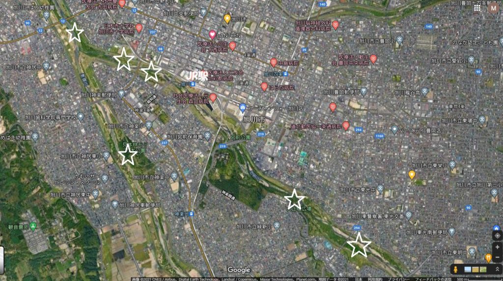 今日も暑い暑い日になりそうです。コサインでは、30℃を越える日は、栄養と水分補給の足しにと果物、野菜のパックの飲料水を親睦会より出してくれます。暑さ対策は、工房の窓をオープンにし、大きな扇風機を随所でまわして居ます。一方ショップ、業務棟ではクーラーを設置してして居ます。パソコンが発する熱も結構なものです。そして、私の部屋ですが、風通しがよく意外と涼しいので、対策は窓を開けています。 今時とは言いませんが、先日札幌で熊騒ぎがありましたが、旭川も例外ではありません。何といっても盆地なのでぐるり山に囲まれていますから、近郊の山々からだけではなくどこからでも来れるわけです。既に、旭川駅周辺まで来ています。写真は、コサインの森をサポートしていただいています「もりねっと北海道」代表山本牧さんの情報です。地元ネタですが、痕跡からの推定では13日ごろに美瑛川沿いの見本林に来て数日過ごし、その後は18日に駅に近い忠別橋、22日に右下の緑東大橋、25日に左上の旭川大橋で痕跡があります。街の真ん中の川を、移動というより居着いて往来している感じです。旭川駅裏を中心に忠別川沿いに約5.7km。クマは忍耐強く、河畔林にとどまっていますが、いつまで辛抱してくれるのか。少なくとも河川敷には近づかないで下さい。そして、旭川市や警察はこの現状にどう対処するのでしょうか。もう2週間も経っています。投稿から、熊と共生のための策が取られていないと思います。見つければ駆除する?