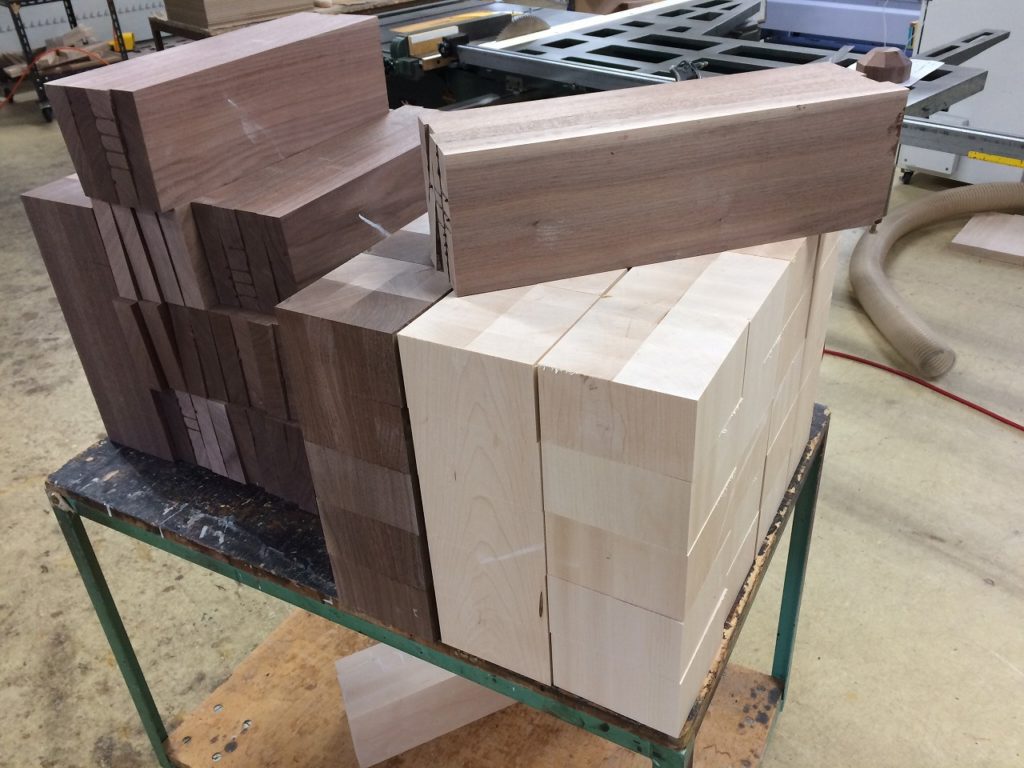 昨日まで、靴ベラの出来上がるまでを紹介させていただきました。今日からは、靴ベラスタンドができるまでを紹介させていただきます。スタンドは半球の形をしています。スタンドに限らず、必要な厚みや幅を数枚の材料を接着し形にします。接着したブロックになるまでに、6工程かかります。次に接着されたブロックからスタンドを5個作る事ができます。次に、靴ベラを差し込む穴を開けます。穴を開けられたスタンドを、半球にしやすいように、周りをカットします。ここまでで10工程目になります。加工する様子を見ていただくとコサインのモノづくりを堪能していただけます。見学大歓迎です。