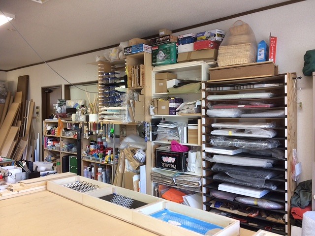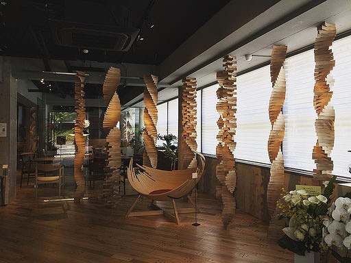 家具を作る際に出てしまう細かい材料を生かせないかと取り組んでいる中で、グループメーカーのショールームで見かけたインスタレーションとオブジェからこれはと思い、デザイナーを尋ねたところ、札幌真駒内にアトリエを持ち作品作りをしている「G・A・A・L]伊賀信氏と知りました。早速、ホームページ、Facebookを拝見し連絡を入れさせていただき、希望をお伝えした所、快く受け止めていただき、LINEで顔合わせをすることになったのですが、私が機械音痴なのでうまくいかず、結局電話でお話をさせていただきました。(笑) 日を置いてアトリエを訪ね作品を見せていただきながら思いを伝えさせていただきました。出会いの始まりです。