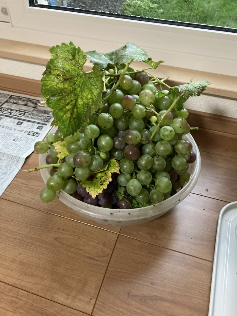 あまりにもぶどうの実がなり、とうとう棚が倒れてしまいました。まだ完熟していないのですが、妻が、ジュース、ジャム、果実酒を作っている傍らで91歳に母が、美味しいとつまんで食べてます。(笑)今年は、お米も豊作で豊作貧乏だと聞きました。青空産業はお天気に左右され大変ですね。工房では、テーブルの塗装をしていました。塗装は、植物性オイルです。最終研磨された天板にオイルを塗布し、刷り込むようにして拭き取ります。オイル塗装は、自分でメンテナンスができるところが良い処で、半年又は1年ごとにメンテナンスをお勧めします。要は、お化粧と同じで、塗り込むほど肌が良くなり美人になます。逆にほって置くとカサカサになってしまいます。塗り込むほど良さが増し木の素材感が生きるのがオイルフィニッシュの特徴です。