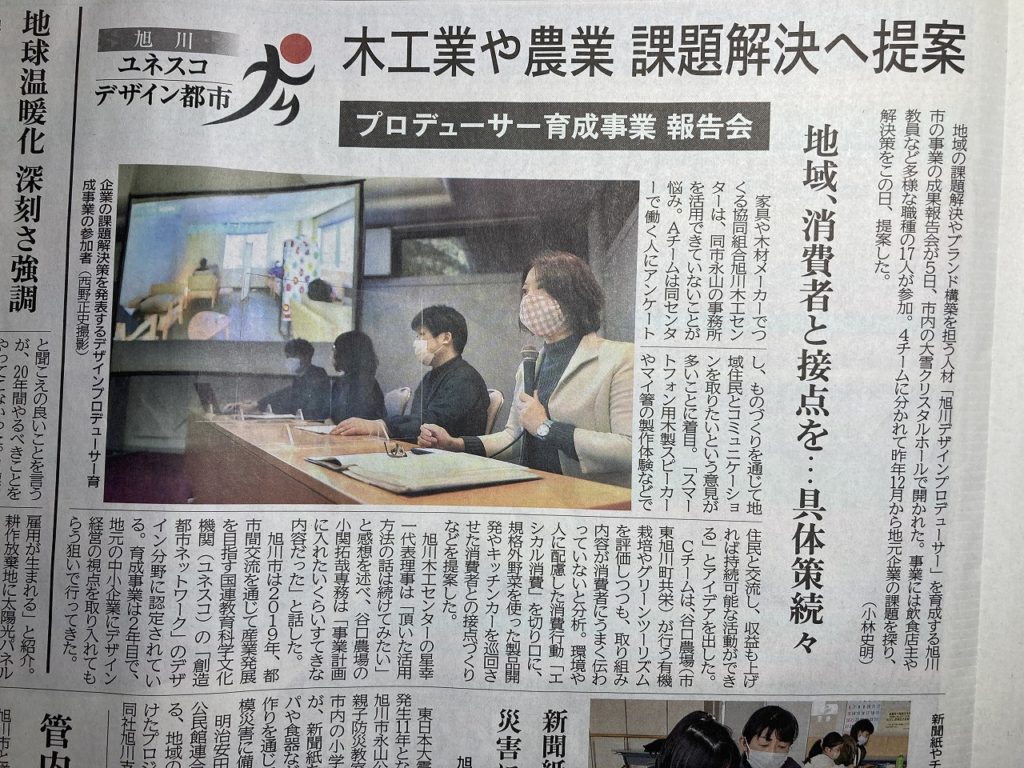 旭川市主催、「旭川デザインプロデューサー育成事業2021」の成果発表会が3月5日、大雪クリスタルホールで開催され、出席しました。昨年に続いて2回目のとなる事業です。旭川市は、デザインプロデュースの実践的な研修を実施し、デザイン経営導入、旭川市のブランド構築やイノベーション創出を図るために、2020年度から「旭川デザインプロデューサー育成事業」を始動し、2021年度より事業者とデザインプロデューサーを繋ぐ=ハブ(hub)サイトを立ち上げました。 開催要領として、ベーシックプログラム(全4回)とハンズオンプログラム(約3か月)の2部構成で基礎~実践を学びます。ハンズオンプログラムでは、ベーシックプログラムの受講者30名から有志かつ、主催者からの適性判断を経て最大15名の受講者を決定。話題提供会社となった、谷口農場と(協)旭川木工センターを対象とし、4~5名で構成された、各2グルームが取り組みました。発表会では、意見を求められましたが、(協)旭川木工センター所属の10社450名が働く社員の幸せをテーマとして取り組んでいただき、今後に活かしたいと思います。半年に渡りご苦労様でしたと共に、若い世代の方々が郷土を思う気持ちを感じ感謝しています。
