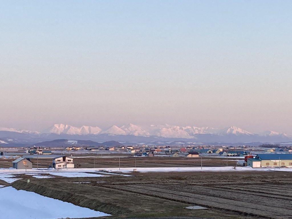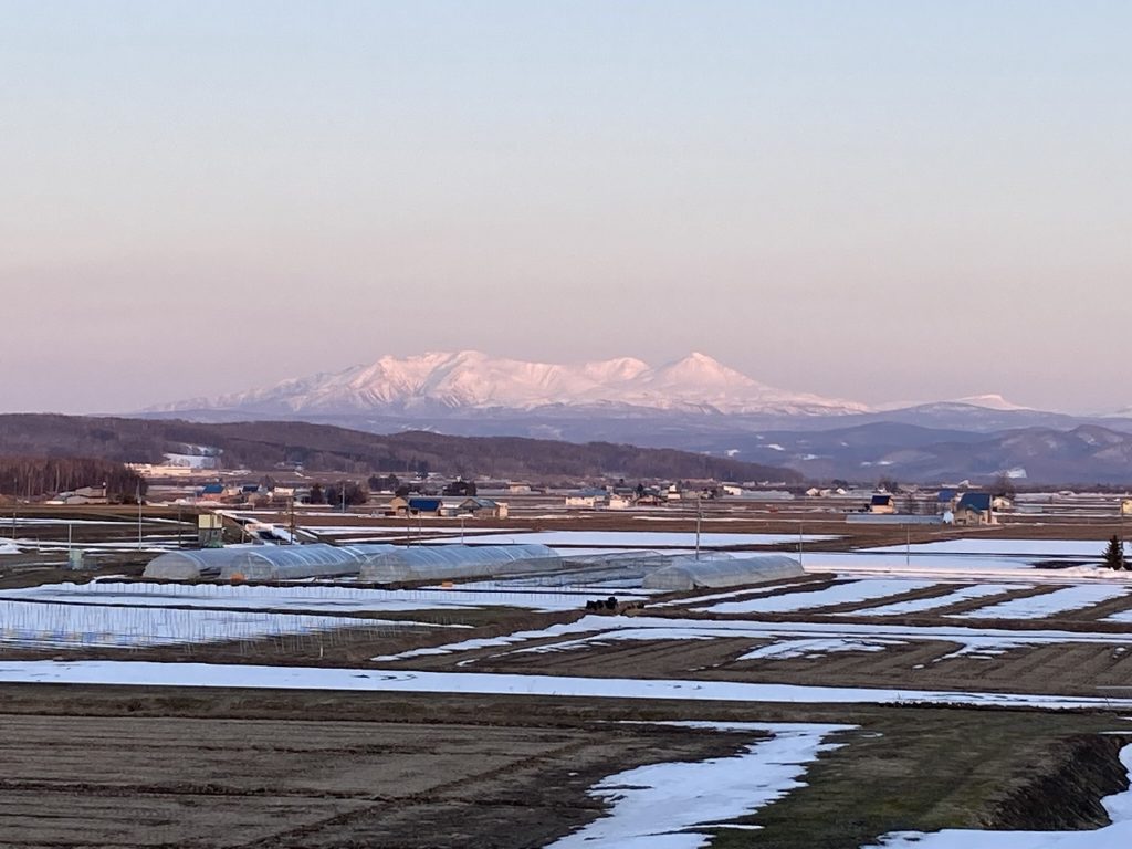 今にも雨が降り出しそうな空模様の中、AIRDOの飛行機が旭川空港を目指し飛んで行きました。気温も高くなり氷点下の朝も少なくなって来ました。そろそろ冬タイヤから夏タイヤに替え時かと思いますが、5月に思い切り雪が降った事もあるのでわかりません。写真は、先日行きましたコサインの森の帰りに写したものですが、沈みかけの夕日が大雪山連邦を包んでくれています。北海道最高峰の旭岳2,291mに次いで十勝岳が鎮座しています。まだ、たっぷりと雪があり5月までスキーが楽しめます。また、雪が融けた田んぼに白鳥の群れが飛来し餌を求めています。こちらも、春の風物です。また、水田農家のハウスでは苗を育てていて、今年の豊作を願って農作業も始まっています。