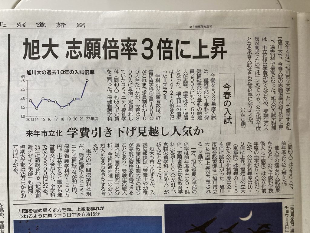 今朝の朝刊によりますと、来年4月「旭川市立大学」として開学する私立旭川大学の今春の志願倍率が過去10年で最高となったと載っていました。待ちに待った公立化、メリットは学費が安く学べると言う事でありますが、これだけの自然に恵まれた中で学べることもあると思いますし、知って欲しいと思います。さらに私たちが期待しているのは、2025年に新設される「地域創造デザイン学部」です。故長原實氏が命をかけて取り組んだ旭川にものづくり大学の新設を適える事ができるのです。2011年8月8日、旭川に公立「ものづくり大学」の開設を目指す市民の会が設立され、様々な活動を行いました。真冬の寒さも厭わず署名活動を行い2012年11月29日、旭川に公立「ものづくり大学」の開設を目指す市民の会から要望書の提出~約4万3千筆の署名を旭川市に手渡し、その後様々な展開の中、旭川市立大学に新設される運びとなりました。この間、13年の歳月が過ぎてしまい、想いを見届ける事ができなかった長原氏も安堵している事と思います。