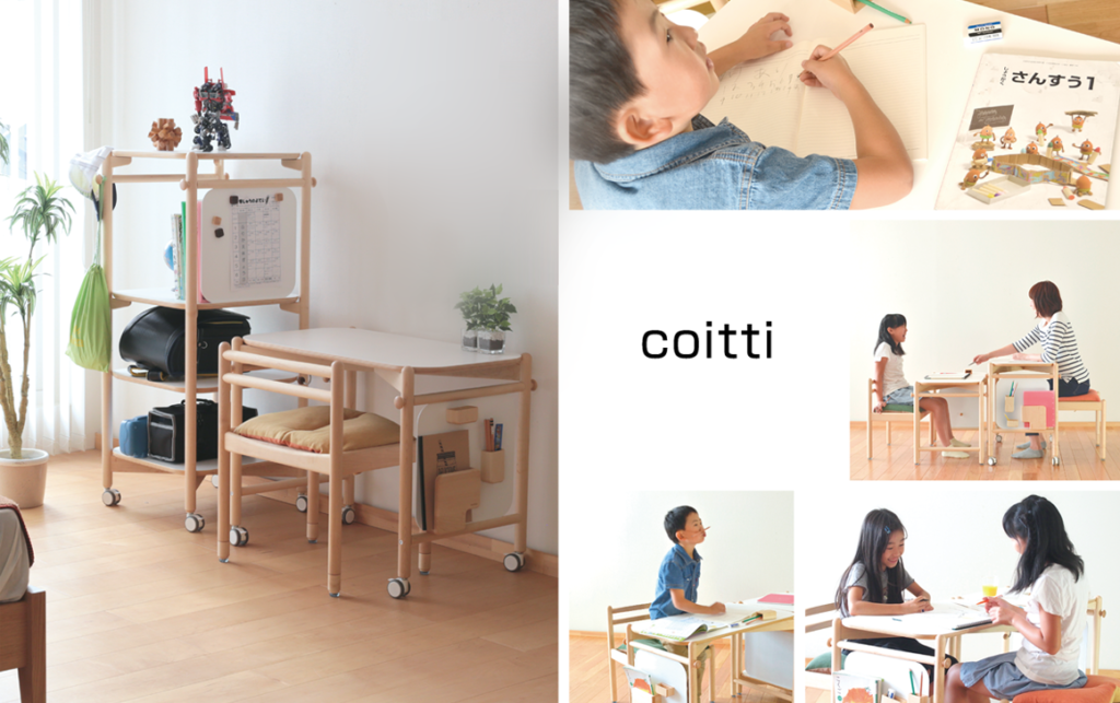 子どもから大人まで、家族みんなで使える学習家具シリーズ『coitti』は、家族の会話や学習道具の片付け、部屋の移動など『何気ない日常をつなぐ家具』をコンセプトに誕生しました。