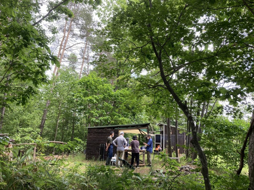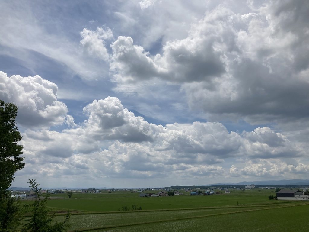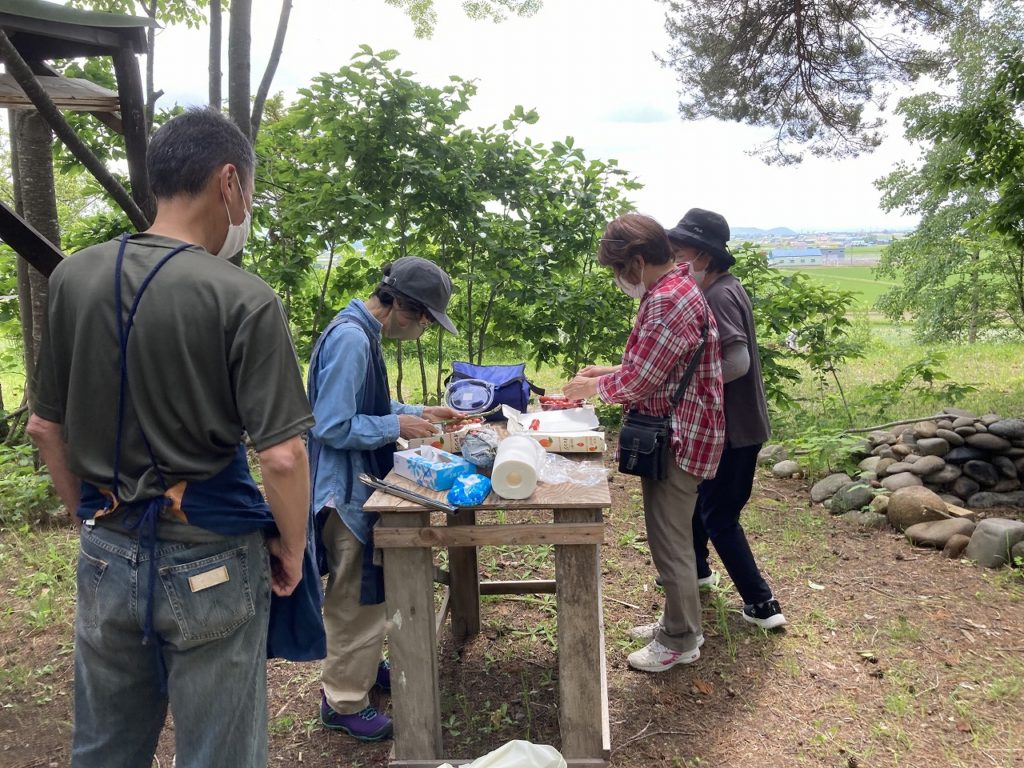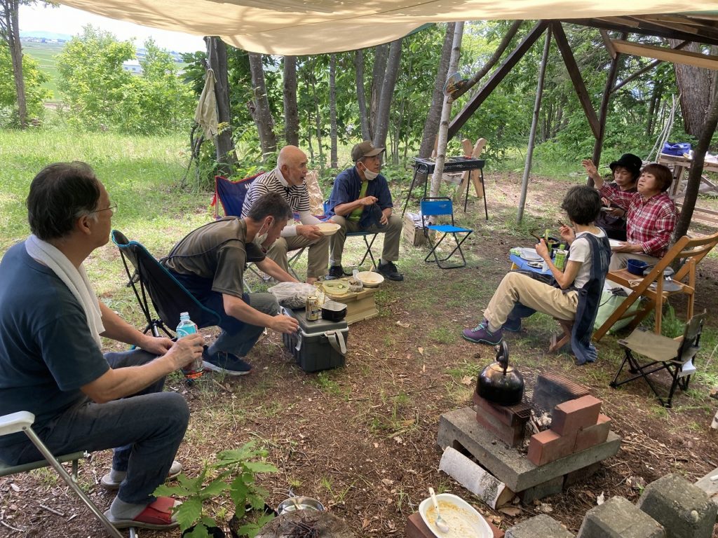 LINEグループ「OUTDOORわく²倶楽部」のメンバーによる野外BBQを、メンバーの所有する森「Gの森」で行いました。森の前方には大雪山連邦が広がり、手前には水田が作られています。森には、赤松、白樺、楢と言った木々が立ち並び、その一角の広場で楽しみました。手分けして準備に取り掛かるのですが、原始的な火起こしから始まり、出来るだけゴミを出さない事として、マイ食器を持って来ました。トマトの串焼き、アスパラの肉巻き、長ねぎの丸焼き、ホタテ、カキ等々。そしてメインはカレーライスと次から次と食べるは食べるは(笑)。みんなで食べれば怖くない。さらに各自が持ち寄ったコーヒーやデザートをいただき満腹120%でした。身近にこんな事が楽しめる仕合せがあります。次回は、コサインの森の小川の川原でと約束し解散。